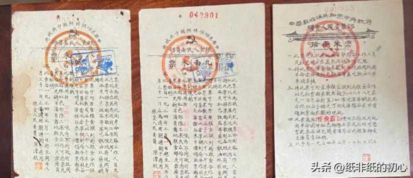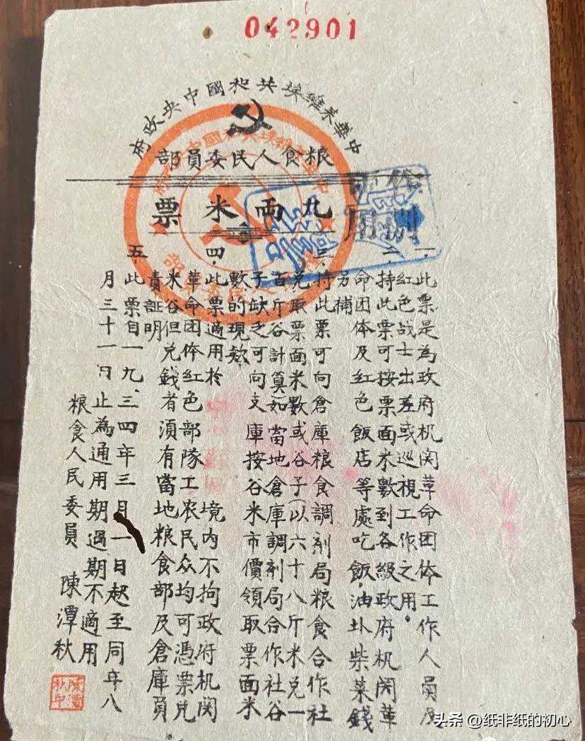 这是一套以苏维埃共和国中央政府粮食人民委员部名义发行的米票。与前面“两证一票”的最大区别就是苏维埃政府军政人员的粮食“支付凭证”。也是中国共产党最早发行的“粮票”,发行机构是我党最早建立的”粮食部”!它与建国后1955年下半年发行的全国通用粮票仅仅相差21年之久。实践证明,我党早期就知利用经济手段调控、平抑市场价格。