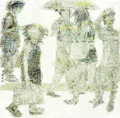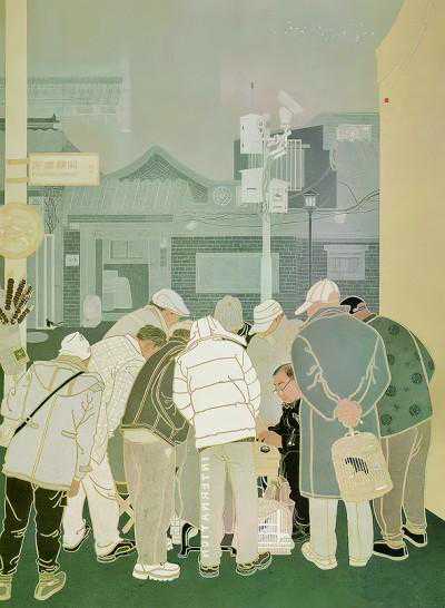 画家的主观意识是影响画面色彩的重要因素,而主观意识所承载的,不仅有对客观物象的审美体验,还有本民族特有的文化心理与哲学、美学思考,它是自然观与世界观下艺术感知的集中体现。试看王岚的《茶香》、杨柳的《女人街上的太阳伞》和邱诗淇的《皇城棋遇》,这三件工笔人物画作品皆运用简约单纯、清新灵动的色彩,表现了当代都市的寻常一景,主题与画面色彩和谐相应,营造出一种超然的心象空间。创作者在追求古雅简阔的色彩表现的同时,更加崇尚色彩体系的观念意象,弱化了外物本身的形制与色彩的客观真实性,降低色彩的纯度与对比度并选择同类色系,将色与墨的并置建立在融合于遐想空间的绘画章法布局中。在以现实生活为题材的创作中,当代工笔人物画家强化了作品的民族性与当代性,更加明确了传统中国画的色彩观。