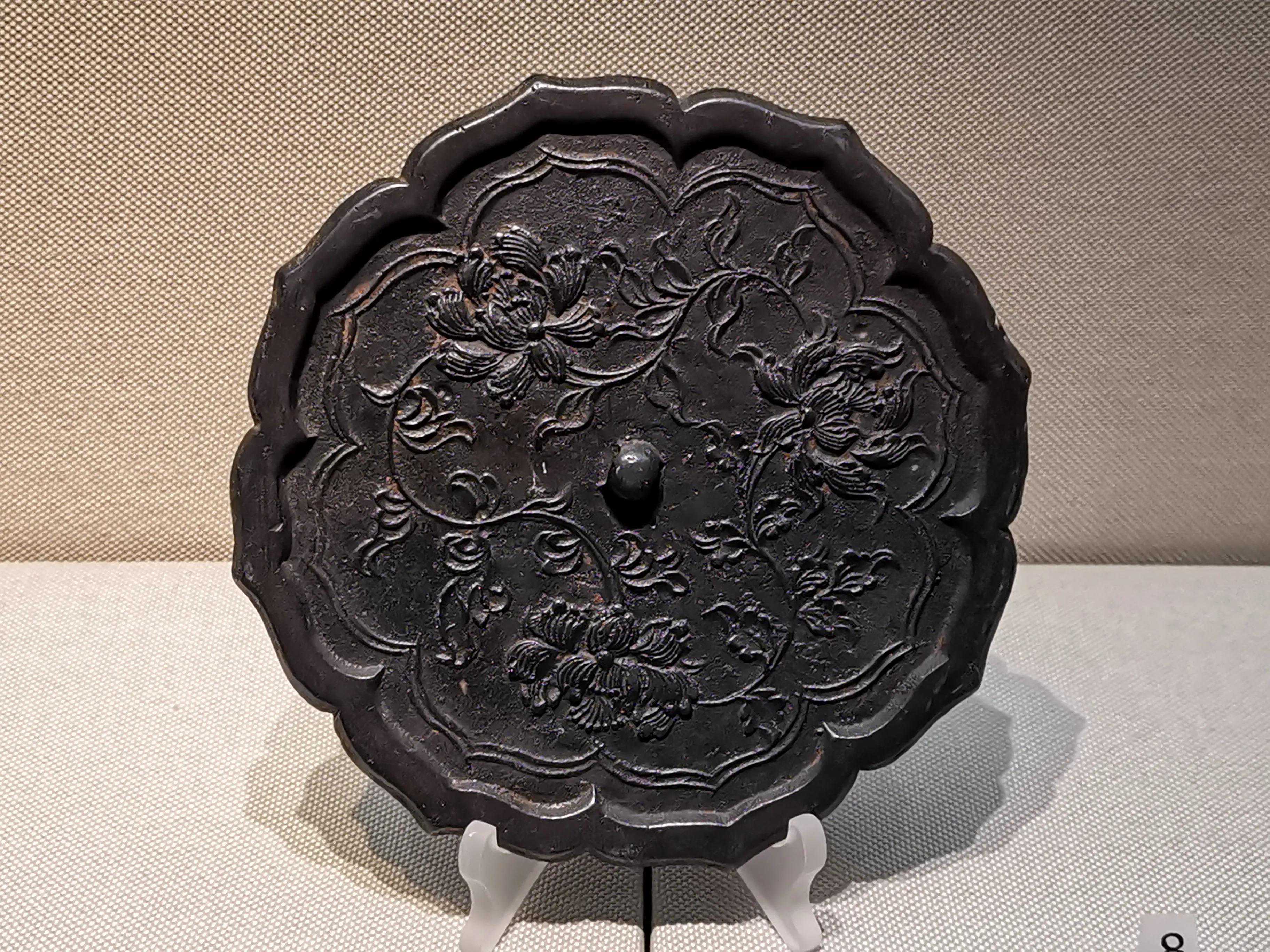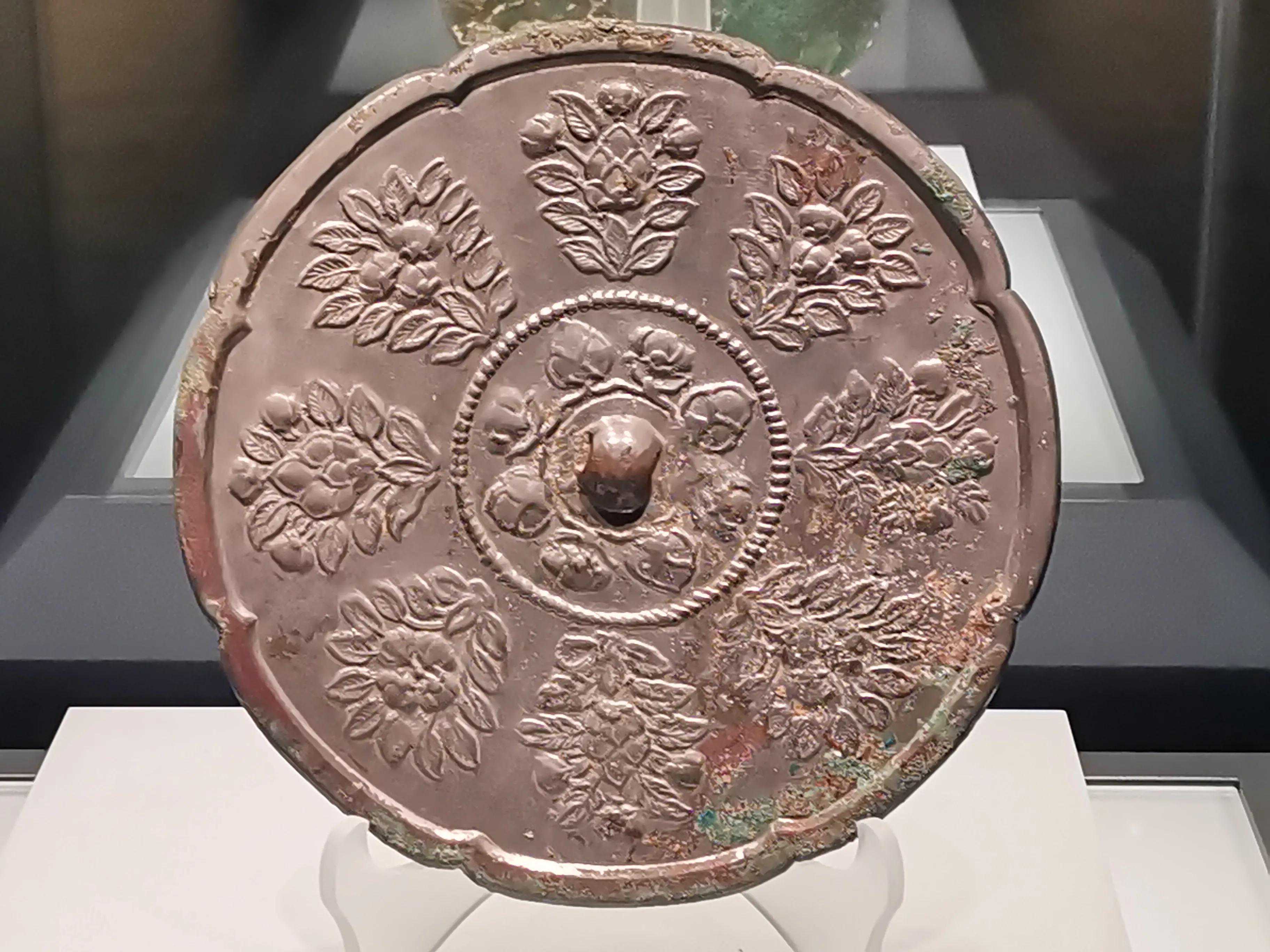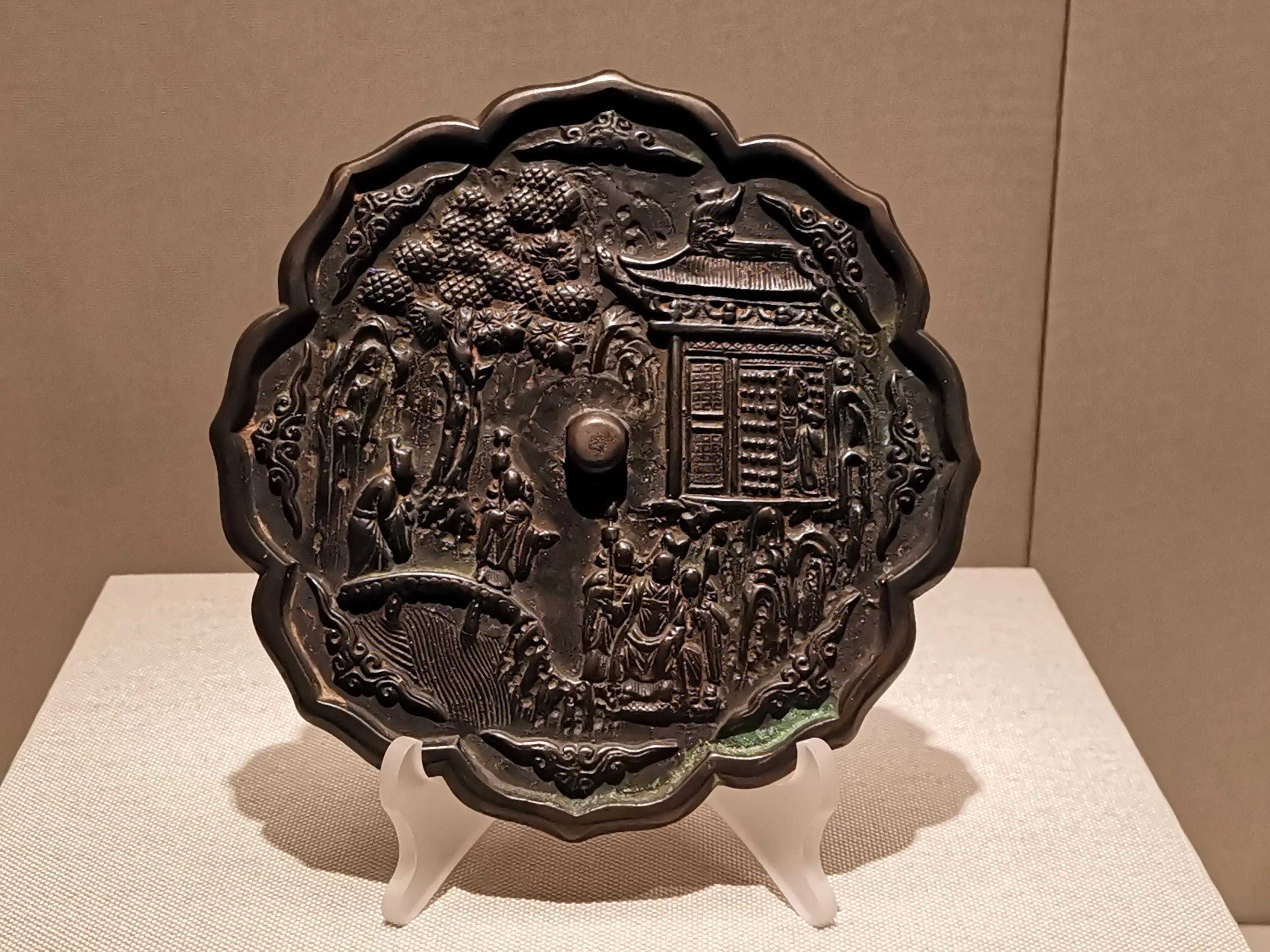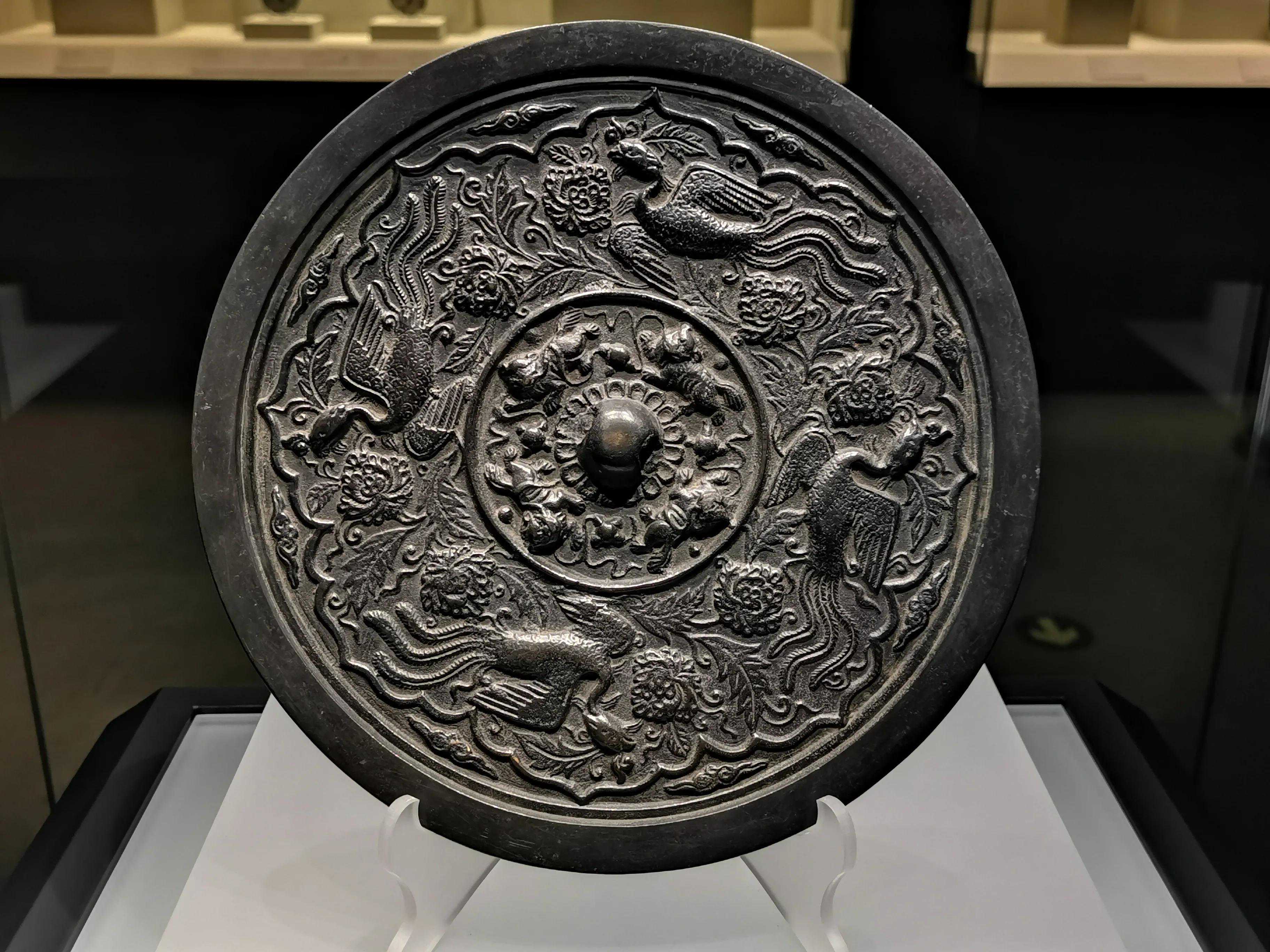 唐代铜镜不仅突破了之前以圆为主的形式,出现了菱花、葵花、方形、亚形镜,而且纹饰也突破了汉镜的刻板及图案化,布局灵活多样,题材丰富多彩,且有异域人文色彩。花鸟菱花镜、瑞兽葡萄镜、人物故事镜等,都反映着盛唐的气派,突出一种繁荣的氛围,充满了盛唐欣欣向荣的生活气息。工艺方面还出现了金银平脱镜、螺钿镜、贴金贴银镜等,成为后世铜镜铸造所无法超越的又一个高峰。其中瑞兽葡萄纹镜又称海马葡萄镜、海兽葡萄镜、狻猊葡萄镜。流行于盛唐,多采用瑞兽、花鸟、葡萄等图案做装饰。葡萄是汉武帝时张骞出使西域带回中国,其图案已经出现在汉代丝织品上,唐代将其与瑞兽纹巧妙地结合在铜镜装饰上,突破了汉镜规矩的格局,呈现出包容万象、海纳百川的盛唐气象。唐代铜镜另一流行纹饰是双鸾镜,也称对凤镜,主题纹饰是双凤对舞,口衔绶带。绶是古代系官印的丝带,代表官秩禄位,配以吉祥的莲荷图案和具有瑞象的凤,应是世人求取功名的美好愿望。