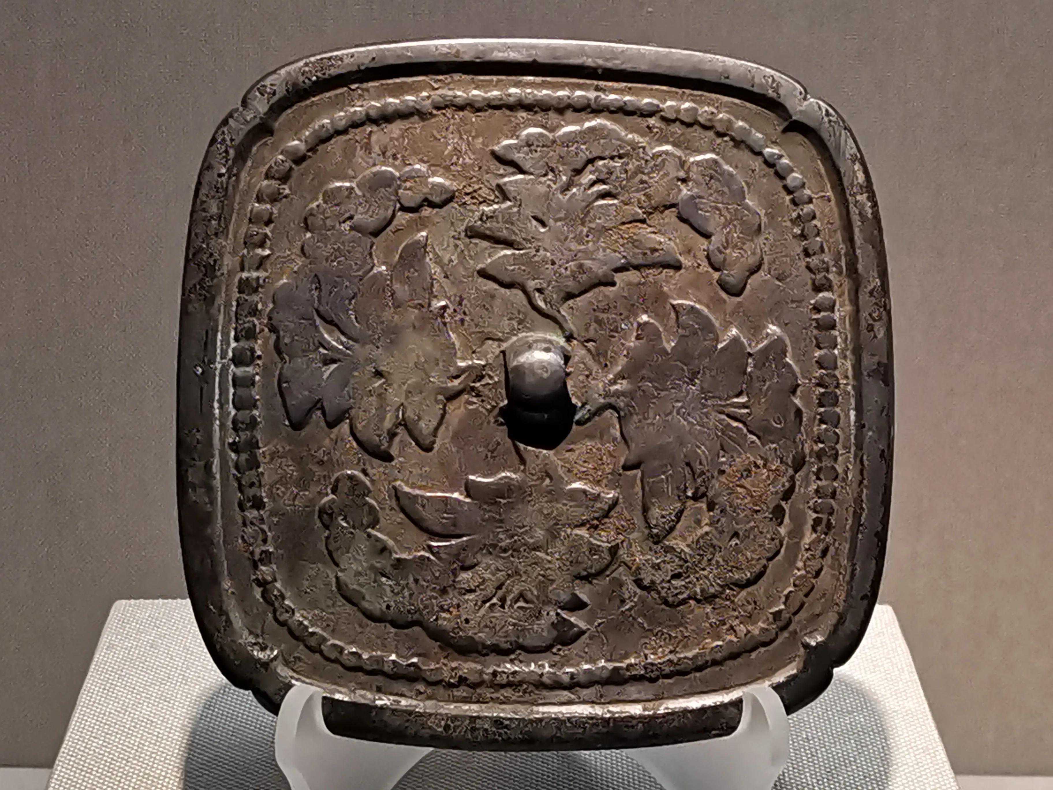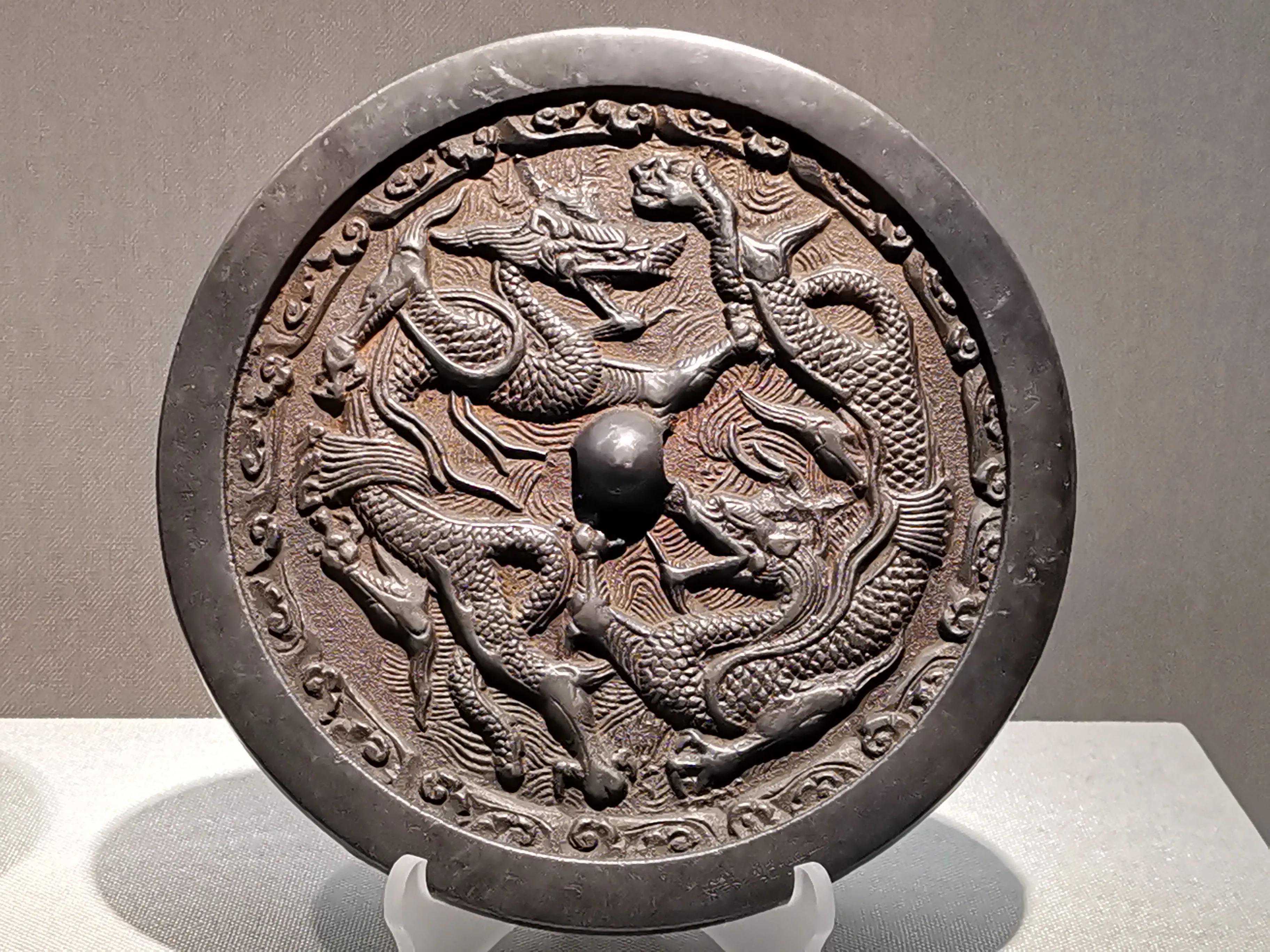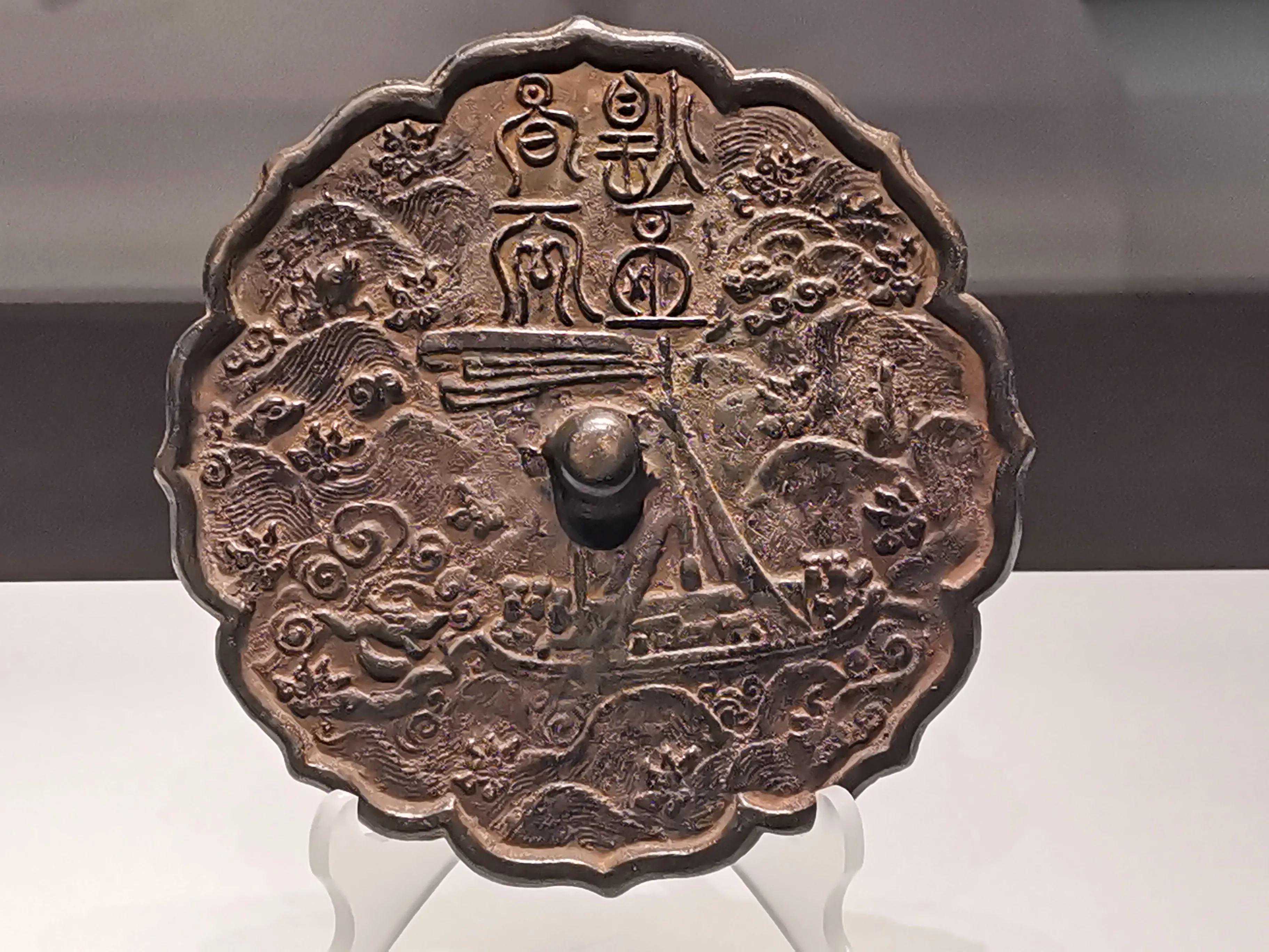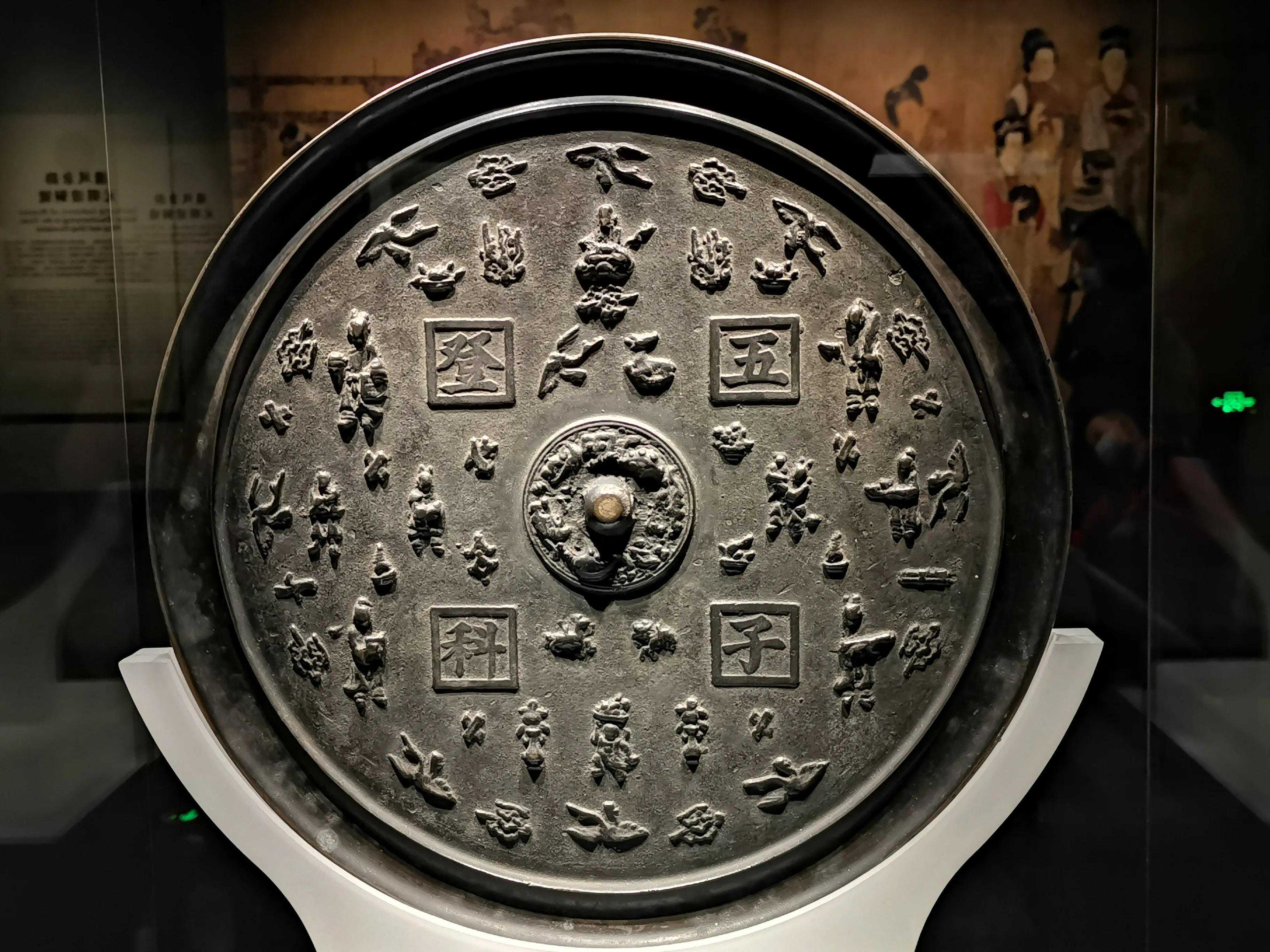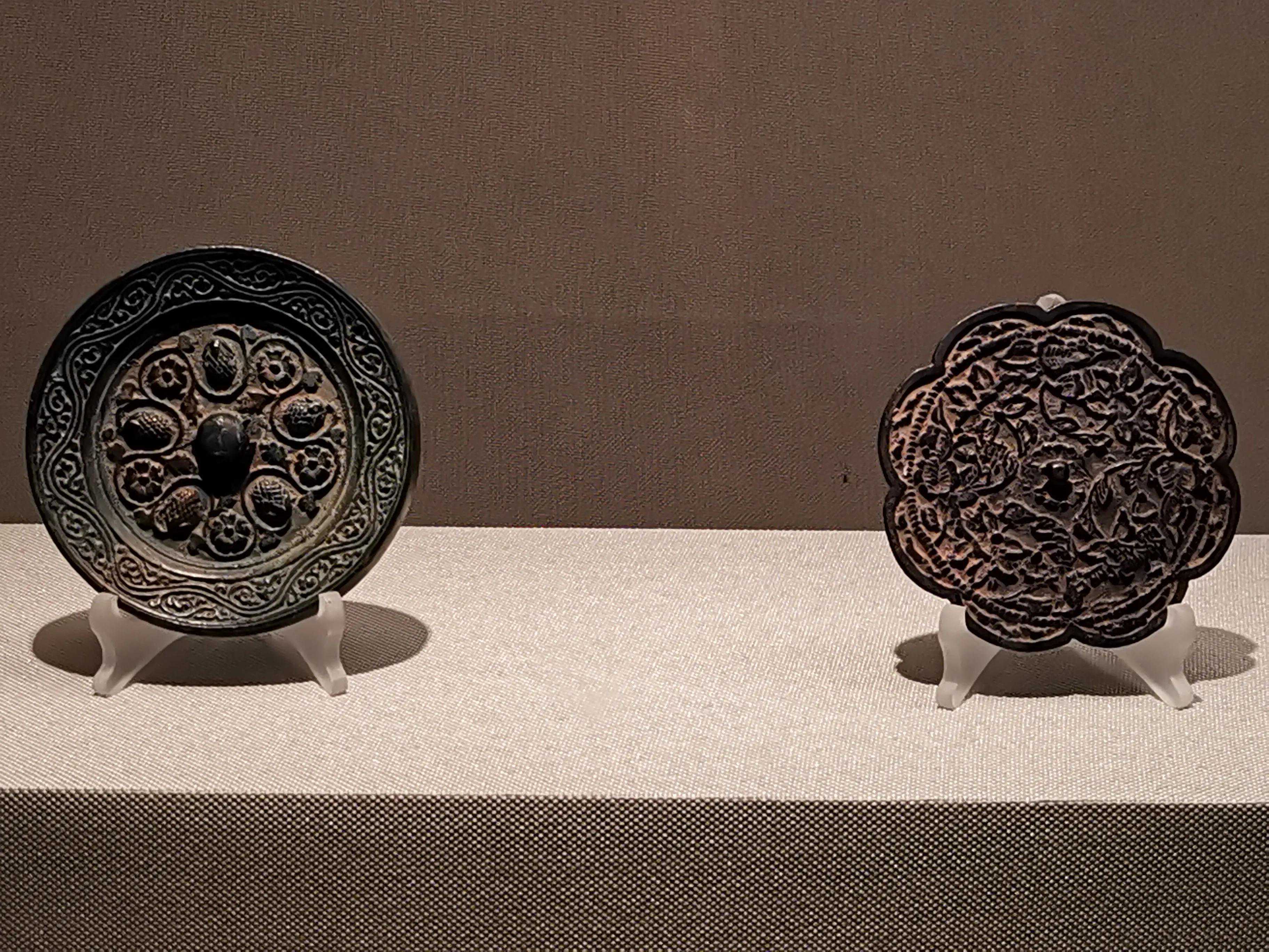 唐代铜镜不仅突破了之前以圆为主的形式,出现了菱花、葵花、方形、亚形镜,而且纹饰也突破了汉镜的刻板及图案化,布局灵活多样,题材丰富多彩,且有异域人文色彩。花鸟菱花镜、瑞兽葡萄镜、人物故事镜等,都反映着盛唐的气派,突出一种繁荣的氛围,充满了盛唐欣欣向荣的生活气息。工艺方面还出现了金银平脱镜、螺钿镜、贴金贴银镜等,成为后世铜镜铸造所无法超越的又一个高峰。其中瑞兽葡萄纹镜又称海马葡萄镜、海兽葡萄镜、狻猊葡萄镜。流行于盛唐,多采用瑞兽、花鸟、葡萄等图案做装饰。葡萄是汉武帝时张骞出使西域带回中国,其图案已经出现在汉代丝织品上,唐代将其与瑞兽纹巧妙地结合在铜镜装饰上,突破了汉镜规矩的格局,呈现出包容万象、海纳百川的盛唐气象。唐代铜镜另一流行纹饰是双鸾镜,也称对凤镜,主题纹饰是双凤对舞,口衔绶带。绶是古代系官印的丝带,代表官秩禄位,配以吉祥的莲荷图案和具有瑞象的凤,应是世人求取功名的美好愿望。