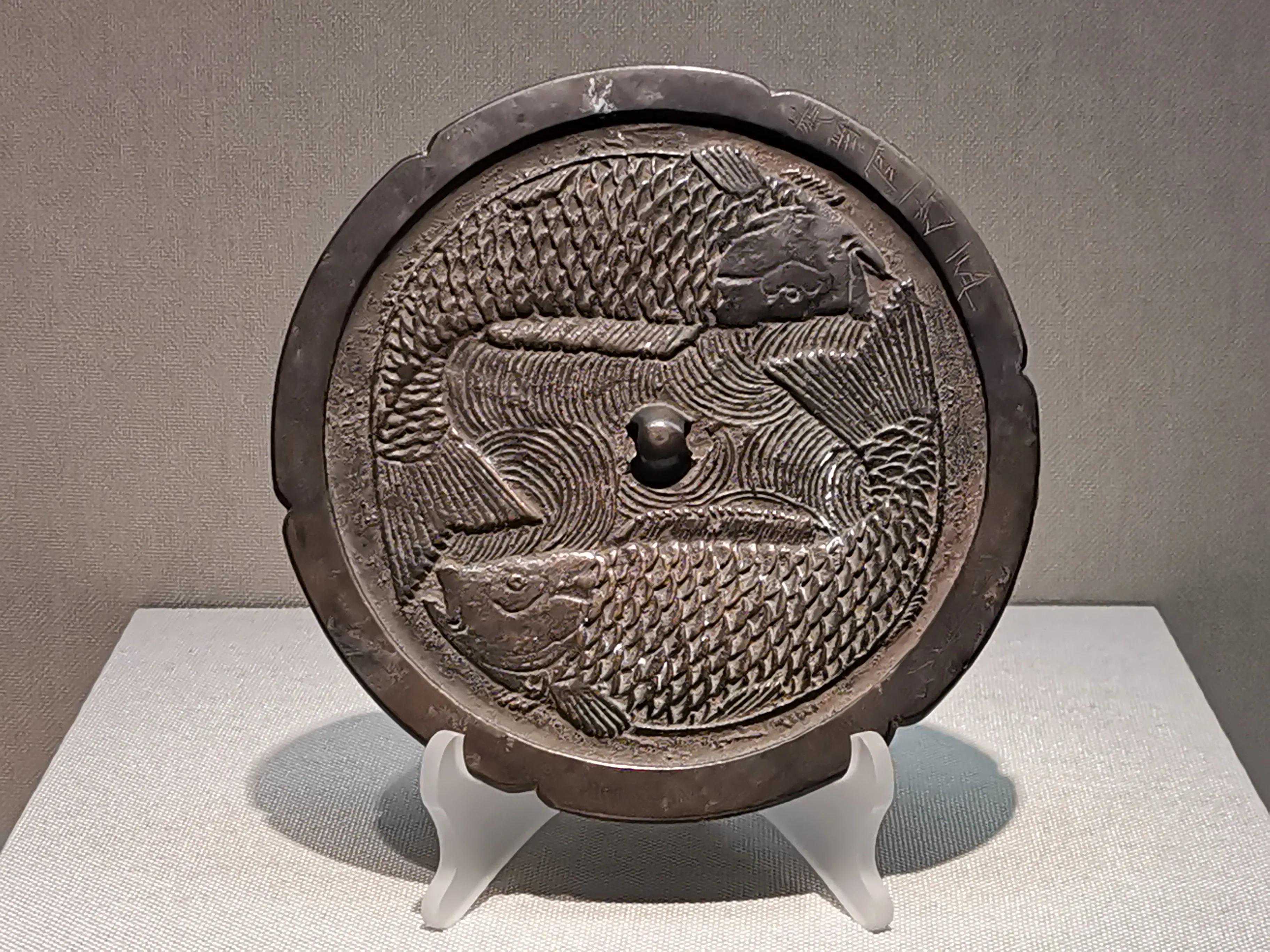 金代铜镜的主题纹饰非常丰富,其内容不仅有中原流行的图纹样式,也有反映本民族传统的内容,表现手法上也体现了本民族的特点,如金代的双鱼镜,采用浮雕的手法体现纹饰,给人以厚重的感觉,内容上也表现了女真人对渔猎习俗的执着。同时,金代的铜镜,无论是刻划双鱼、双龙、花枝或是人物、山石、树木,线条都比较粗犷,在看惯了宋镜的柔曼、纤弱之后,金代豪放的风格,令人耳目一新。由于金代战事频仍,官府对铜金属严格控制,大定十一年后严禁私铸铜镜,一律改为官铸,铜镜铸成之后要经过官方签押才能使用。因此,金代铜镜在镜缘处都有花押,很多沿用下来的唐宋辽镜也被打上了押记继续使用。