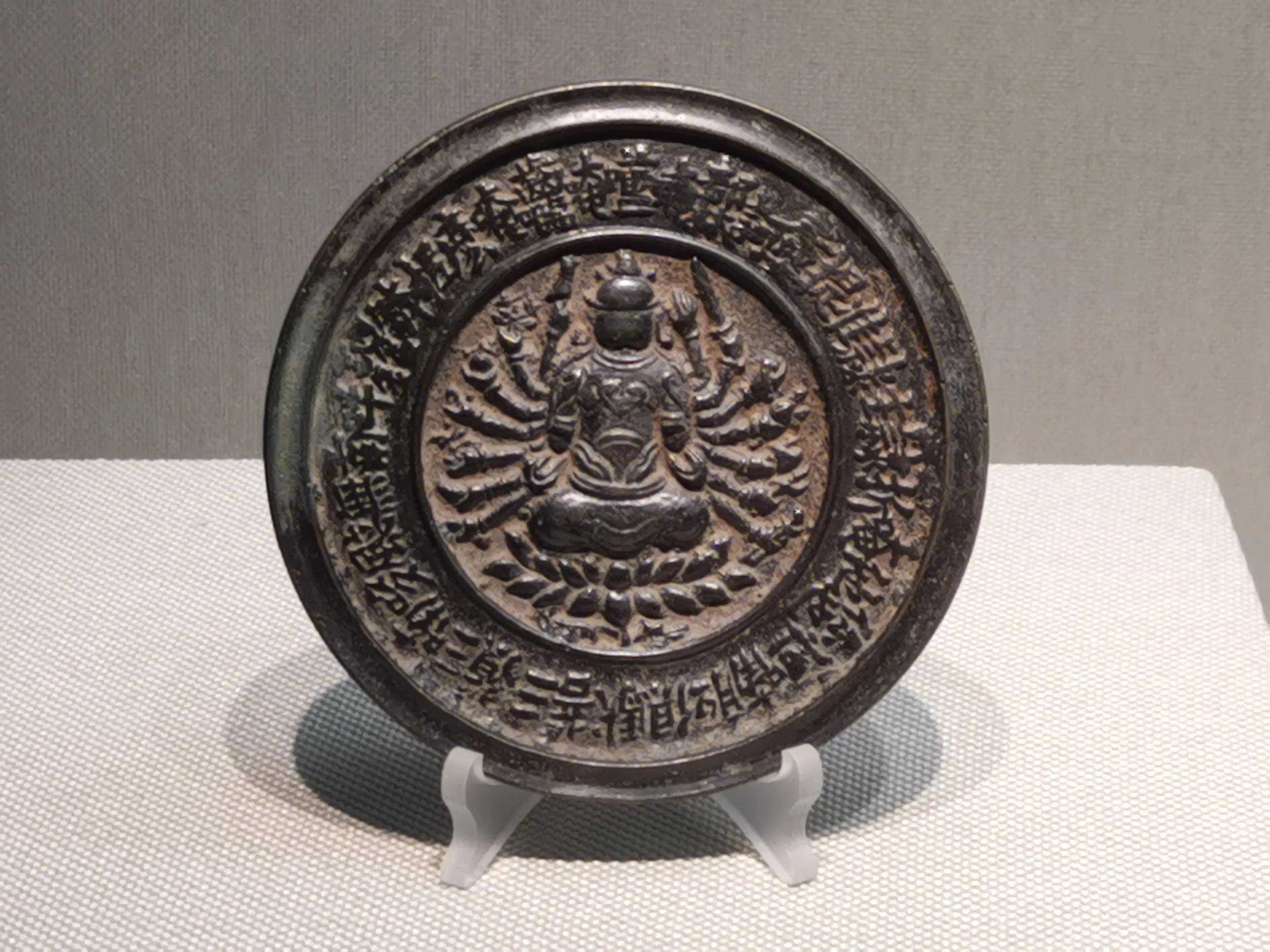 辽镜承继汉、唐镜遗风,又吸收宋镜风格,有其独到之处。如典型的龟背纹镜,采用方圆结合、层层分割、曲直相形的图案,形成独特的四合纹样。龙纹镜以其刚健犀利的细线刻技法,带来高超的艺术表现能力。菊花纹镜,更多地吸收了宋镜缠枝花草的韵味,细腻、柔美而雅致,更以其花形的镜形,达到镜、花合一的艺术效果。辽代铜镜中的迦陵频伽纹镜独具特色,迦陵频伽是佛教故事中的神鸟,人头鸟身,译名美音鸟或妙声鸟。铜镜出土于辽宁省建平县张家营子乡勿沁吐鲁村辽墓,以圆润柔和的凸线勾画迦陵频伽,空白处以花叶补满。以佛教故事作为纹饰题材,反映了佛教在辽代的深远影响。