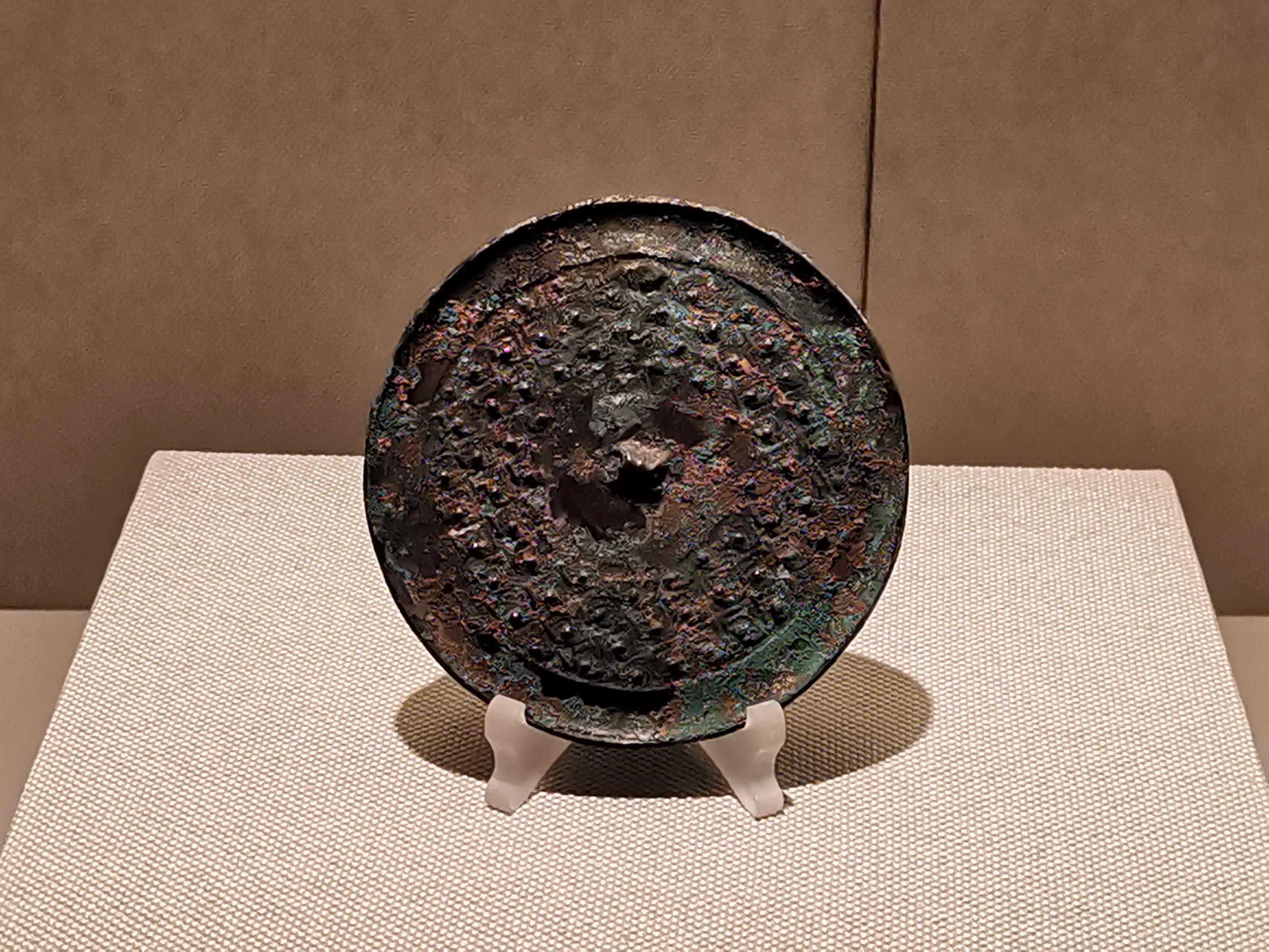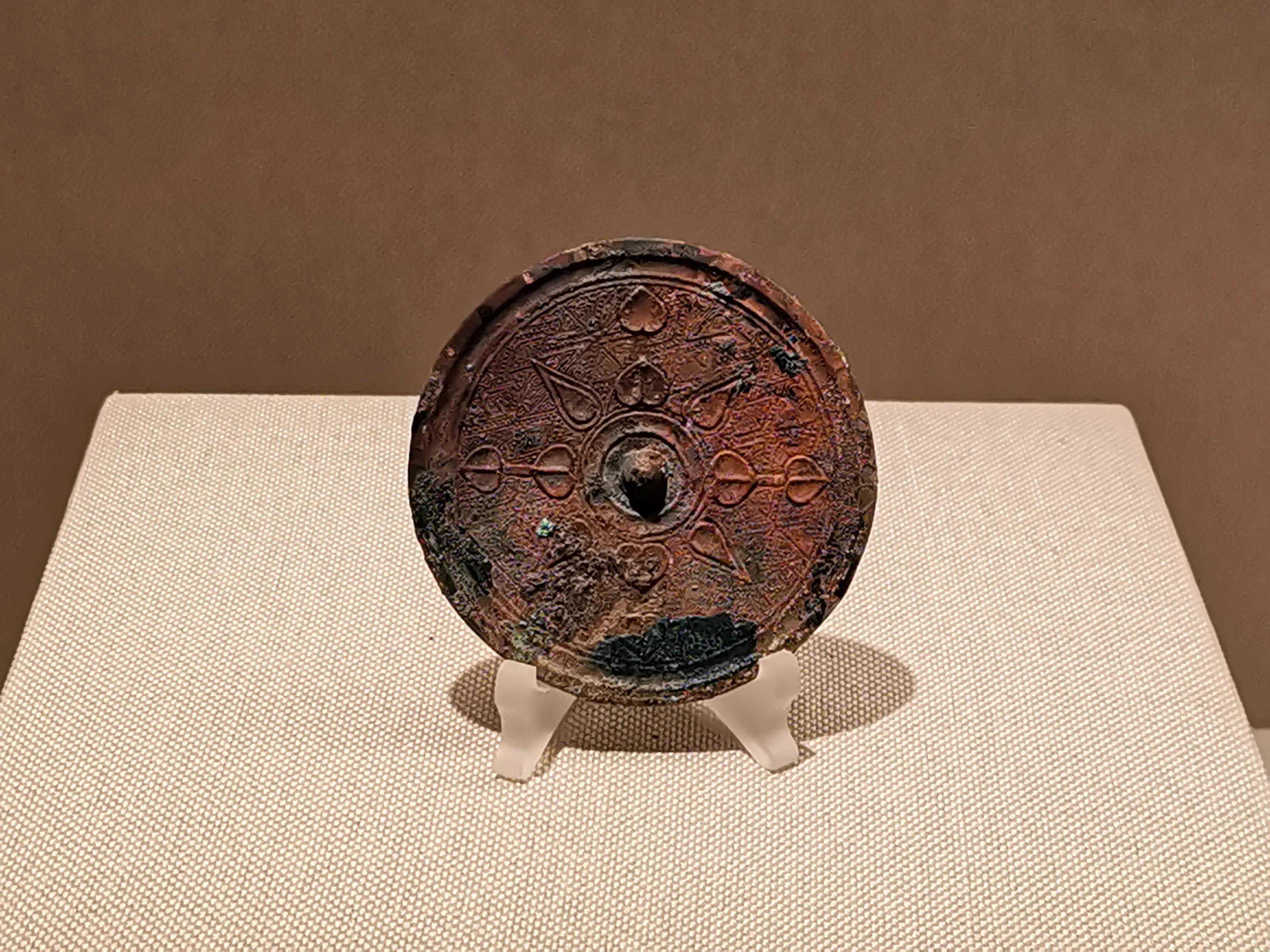铜镜制作发展到战国形成了第一次高峰。纹饰由单纯素面或几何纹样发展到蟠虺纹、云雷纹、山字纹等多种式样。纹饰构建上也由纯地纹发展到有主纹与地纹之别的多层纹饰构成。同时,透雕合铸、错金银、镶金嵌玉工艺在铜镜上的应用是这一高峰期形成的标志。其中山字纹镜通常是在羽状地纹上饰“山”字形图案,可分三山镜、四山镜、五山镜、六山镜等,其中以四山纹镜最为常见,流行于战国早中期,以湖南地区出土数量最多。“山”形纹饰多认为是青铜器勾连雷纹的省略变形。