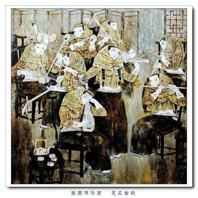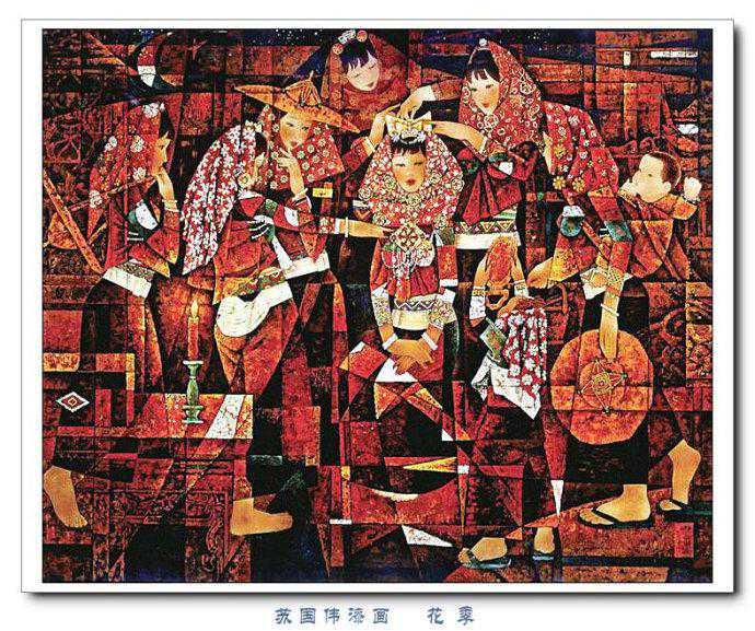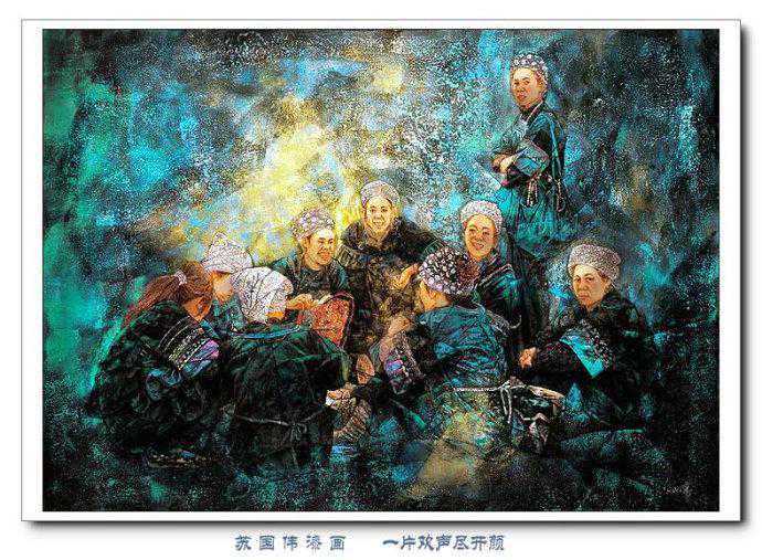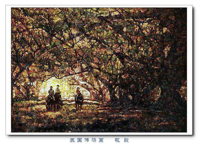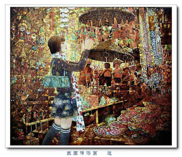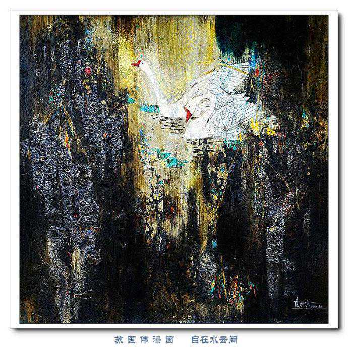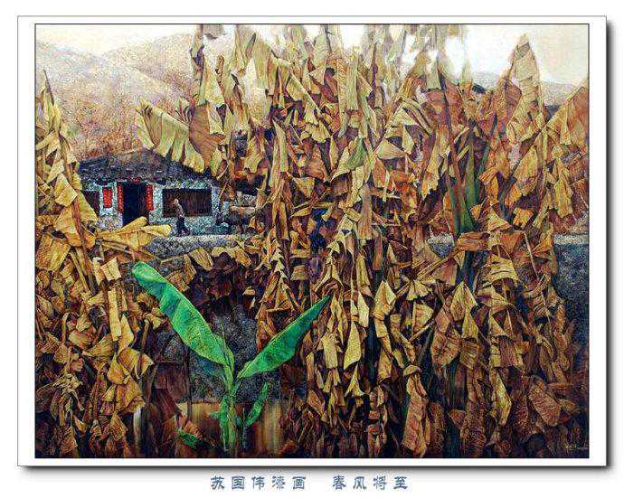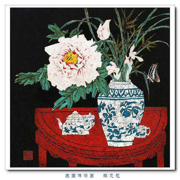 苏国伟从国画、油画、版画等中西方绘画领域中吸收养分,用漆画技法进行自己的诠释和演绎,让漆画更具艺术性。苏国伟擅长人物题材漆画,此类作品画面构图自由活泼,对作品人物的刻划细腻独到,对色彩应用以暖色为主,表现出浓郁的生活气息和较强的感染力。苏国伟花鸟漆画作品形式奔放,构图形散神聚,细致入微,栩栩如生。苏国伟的风景漆画作品多以客家或闽南地域风土为主,画面营造出宁静、深幽的意境,并将中国传统漆艺术沉稳厚重的质感融入作品,传达出画家对家乡的深深眷恋。在近年的作品中,苏国伟在画面形式、肌理、漆艺、材料等方面都进行了不断改革,拓展漆画艺术语言的表现力,努力追求“艳而不厌、繁而不烦”的美学效果。