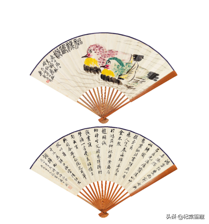 正面福禄鸳鸯。适可居士夫妇银婚纪庆。白石老人画,庚辰五月。钤印:木人背面适可居士夫妇银婚纪念。庚辰五月,元龙萧方骏并识。钤印:息公七十后作释文鸿字伯鸾,尚节介,与妻德耀‘名孟光’隐居霸陵山中,以耕织为业。咏诗书,弹琴以自娱。至吴,为人赁舂,每归,妻为具食,不敢于鸿前仰视,举案齐眉。赵明诚幼时,其父将为择妇,明诚昼寝,梦诵一书,觉来惟忆三句云:“言与司合,安上已脱,芝芙草拔。”以告其父。其父为解曰:“汝当得能文词妇也”。扇骨十六档刻竹扇骨,黄汉侯出稿并刊刻。一面刻黄庭坚《苦笋赋》,款署“汉侯黄玮作于邗上餐英馆中”;另面刻黄庭坚《跋争座位帖》、《送四十九侄诗》,款署“戊辰季春兰痴又笔”。说明1.此柄背面书者为彼时京城四大名医之一萧龙友先生。萧龙友与齐白石有不浅的交情,齐白石最早来北京的时候,寂寂无闻,住在法源寺内,逐渐认识了一些朋友。在这些朋友的帮助提携之下,他才慢慢打开局面。萧龙友便是他最早结识的友人之一。萧龙友之女萧琼与蒋兆和,便是在齐白石的撮合下结为伉俪的。萧龙友为杏林名手,又精诗擅书,与齐白石曾有合作,此柄便为一例。2.此柄刻骨者为民国微刻大家黄汉侯(1902—1976),字良伟,扬州人,生于盐业之家。黄汉侯爱好书画,尤喜牙刻。他先用毛笔临写各家字帖,后用铁笔临摹各家法书,历经寒暑,习艺不辍,技艺日精。而立之年,黄汉侯专攻晋唐以来各家法书,能得其神髓,开创了扬州牙雕缩临技术。郭沫若曾评其微刻为“银钩铁划,玉振金声”。白石老人晚年常作荷花鸳鸯,以贺结缡之庆。此柄《福禄鸳鸯》成扇作品是1940年白石老人以八十高龄精心所绘,以贺“适可居士夫妇”银婚之喜。扇面中以逸笔带出水波,鸳鸯成双,翩翩伴游于其中,复以大字篆书题“福禄鸳鸯”,更添喜气。整幅作品虽仅绘两只鸳鸯,但色、墨交融,洋红、花青、藤黄加之以浓淡相宜的墨色勾勒与点染,栩栩如生。自古人们就将鸳鸯当作忠贞爱情的象征加以歌颂,而白石老人画笔下的并蒂鸳鸯又被增添了更多、更美好的寓意。此扇另一面则是著名中医萧龙友先生抄录“梁鸿孟光”故事,以梁鸿孟光的典故赞誉适可居士夫妇恩爱有加,银婚有庆。萧龙友先生以岐黄名世,书法鲜见,而与白石老友合作,更是难得。白石老人与中医圣手萧龙友先生交情匪浅,在白石老人1917年初到北京,借居法源寺时即认识了萧龙友,并在之后的日子里交往愈多,尤其是在齐白石搬到雨儿胡同居住后,与萧龙友家相距不远,萧龙友的爱女萧琼即拜入白石门下学画,并在之后由白石老人做媒,嫁给了蒋兆和,成就了一对画坛伉俪,留下一段佳话。齐、萧两家常相来往,唱和诗文,见于萧龙友《不息翁诗存》的即有两首,一首是《题齐白石画虾蟹大小鱼图》,诗云:老笔纵横墨味香,森森鳞甲自青黄。可怜画饼难充腹,使我涎流不得尝。另一首是萧老调侃白石老人的游戏之作,诗名《调白石老人》:白石老年犹有子,神完气足善存精。画家花草能供养,调粉和脂自寿生。此扇能请得画坛、医坛两界圣手共同致贺,适可居士夫妇当是齐白石、萧龙友的共同好友,也应是彼时重要人物,可惜史海深远,难以钩沉。幸留此扇,以待有缘人。