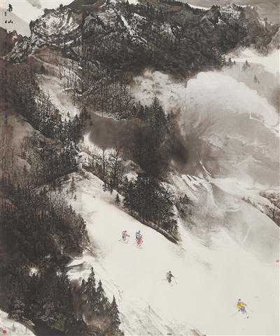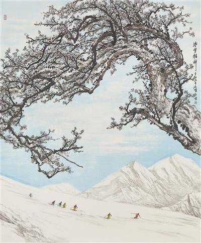回望中国美术史,东晋顾恺之、唐代王维、宋代李成和范宽、元代黄公望和王蒙等大家,都曾创作雪景山水佳构。古人以“留白法”“弹雪法”,借地为雪、托物为雪,通过染天涂地来烘托雪意。通俗一点儿讲,他们画的是环境,是氛围,是文化意蕴,是精神诉求,而非冰雪本身。这种传统的艺术手法,在冬奥题材中国画创作中,被广泛运用。例如何加林的作品《雪山飞鹰》,白云萦绕,雪山巍峨,赛道蜿蜒,着力表现了北方雪景山水的大气和苍茫。山中云气横断以衬雪山之高,远处点缀一道缆车以示雪山之阔。无论是对雪松的勾勒、云气的布势,还是对群山的塑造,作品都“在石之阴凹处皴染,在石面高平处留白……林木枝干以仰面留白为挂雪之意”。留白处即雪。这种留白的艺术手法,含蓄而巧妙,充满悠远与隽永的意味。有人说,雪是冬天的留白。这类运用留白法创作的雪景山水,无疑也是颇具东方山水意境的。