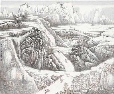 传统的留白法,适合描绘长城以南的雪景,却不足以充分表现北国白茫茫一片、气势磅礴的塞外雪景、冰雪奇观。千里冰封的北国风光,在宣纸上无法得到真实再现,不能不令人感到遗憾。上世纪60年代以来,生在雪乡、醉心于冰雪山水的我,立志要为北国山川立传。银装素裹的林海雪原、美不胜收的冰凌树挂、人迹罕至的极地冰川……我不断在祖国的大地上追寻,在白色的宣纸上直面白色的冰雪,反复摸索、实验,最终以明矾水入墨,从技法上找到了突破点。由于明矾具有托墨托色的效能,落纸的每一笔都会在宣纸上留下水痕,不会消失,恰可表现冰雪的透明感。这种技法突破了古代雪景画的“留白法”,使冰雪变成了作品描绘的主体,以不同于传统的艺术样式,为中国画增添了新元素。