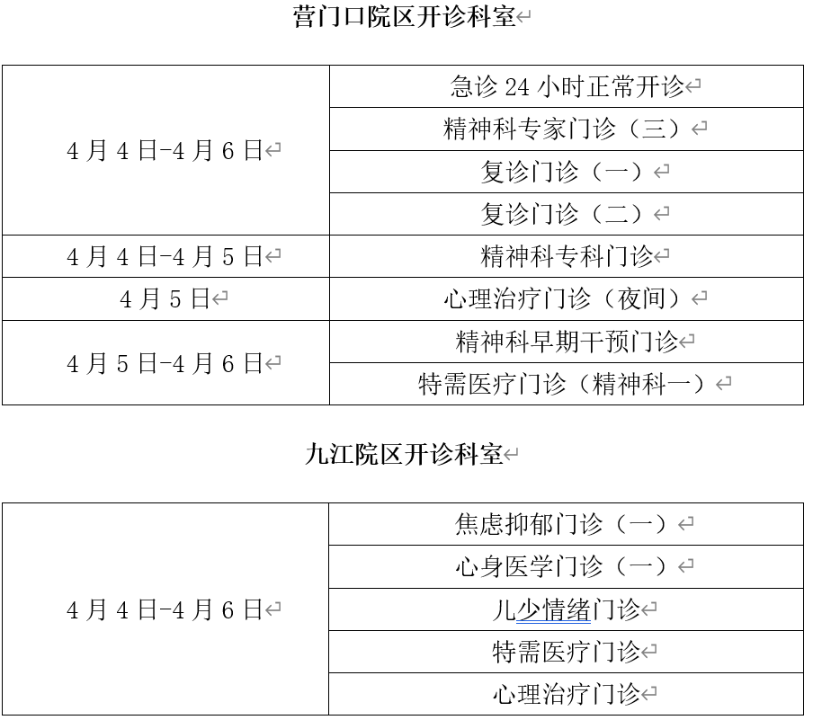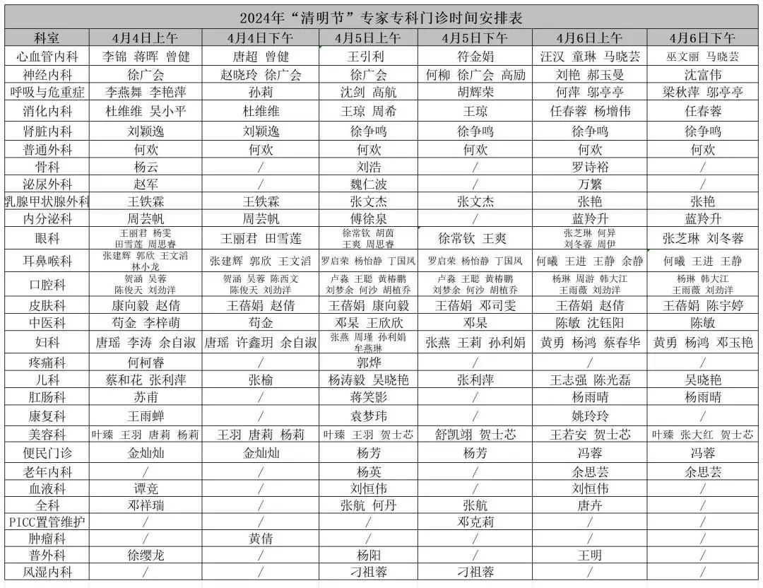 中医外科、小儿推拿科、计划生育科、临床药学科、医疗美容科、门特续方门诊2024年4月4日-2024年4月6日不开诊。