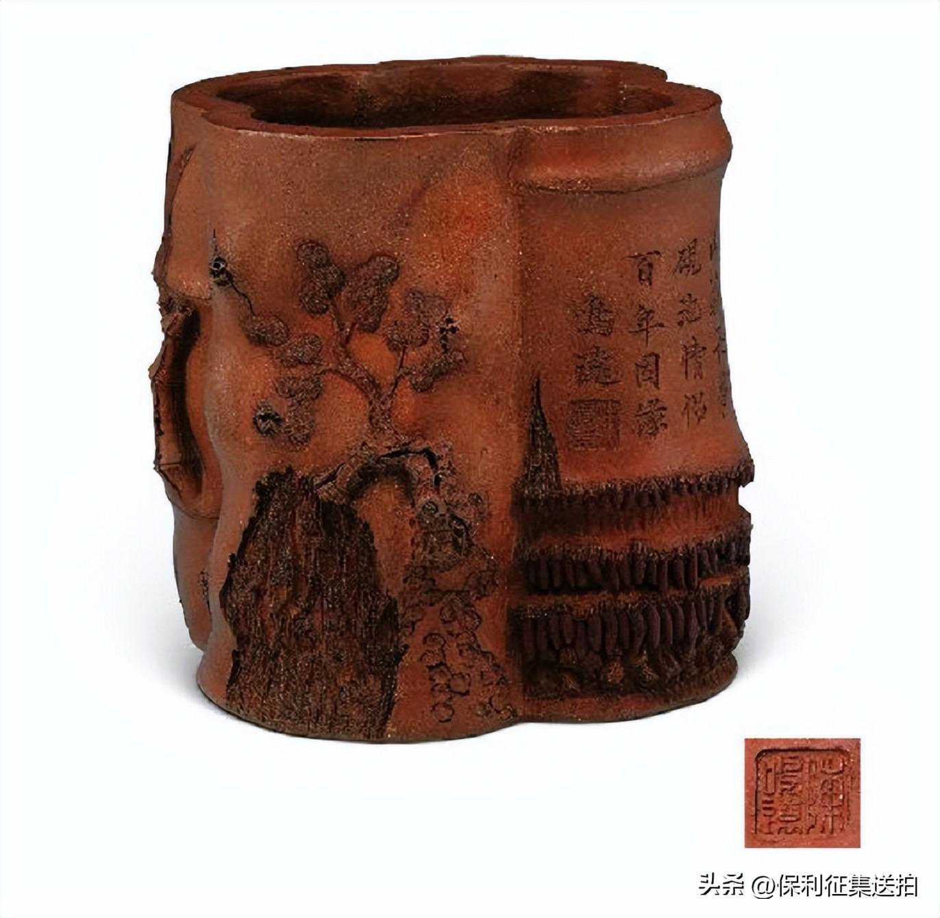 说明:笔筒为海棠型不规则体,四面分别立体雕塑出松、竹、梅。其中三面各自表现岁寒三友"松、竹、梅",形象生动,意境深远。另一面则模仿竹节以及竹根的根须,竹节之上刻有"岁寒清韵,山翁长梦,砚池情侣,百年因缘。"楷书铭文。题记点明了此作品的功用,并用形象的比喻来表现笔筒与砚间犹如情侣的关系,而"岁寒三友"高洁脱俗的"清韵"也一直为中国文人所追求。陈鸣远作品中各自表现松竹梅题材的笔筒有多件,但将松竹梅合在一起表现的,则仅此一件,作品并没有如传统的将松竹梅方在一起的方式来表现,而将笔筒设计成海棠式,四个面分别表现不同。