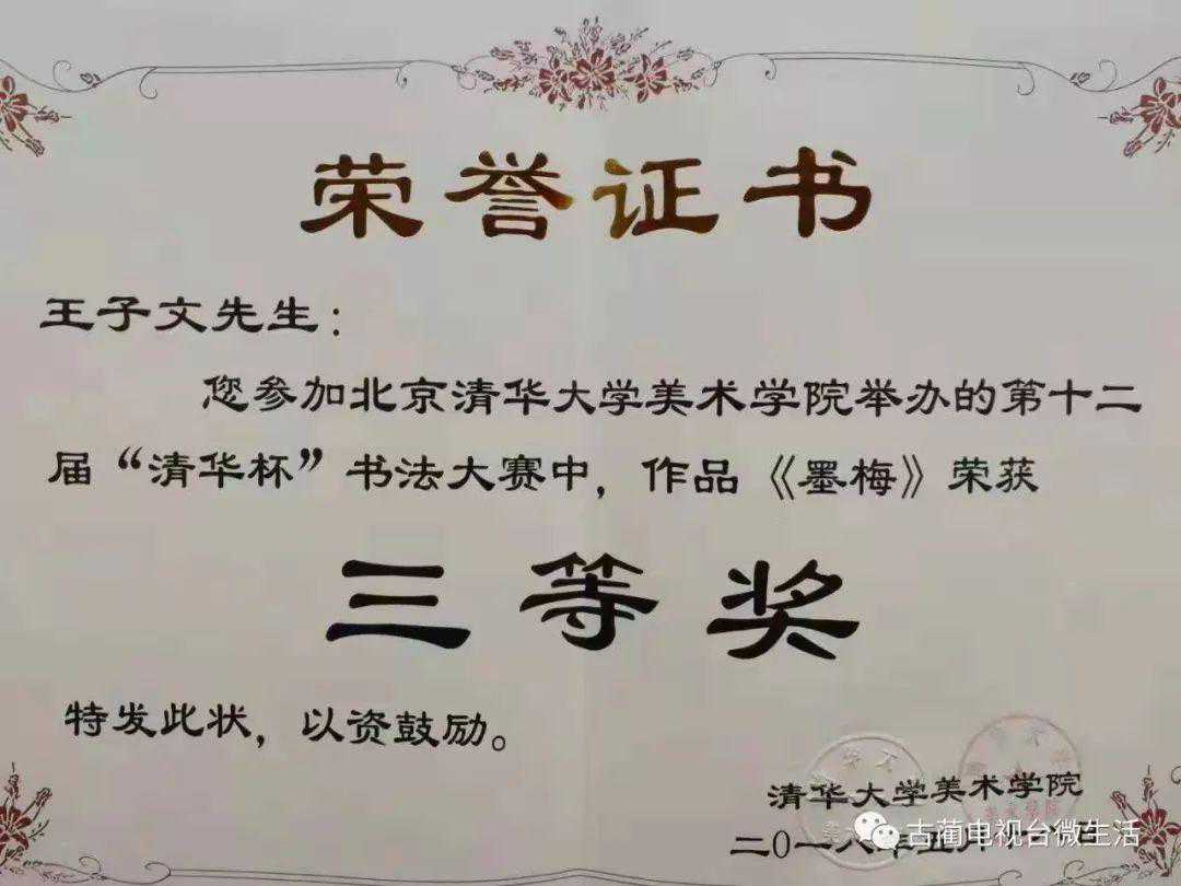 2018年3月5日,部队保送清华大学美术系上学,2018年5月在北京举行的第十二届清华杯书法比赛,作品《墨梅》被评为三等奖。
