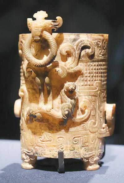 卮是古代盛酒、饮酒的器皿,流行于战国和两汉时期,常用于重要仪式、筵席等。安徽省巢湖市北山头1号墓出土的朱雀衔环踏虎玉卮,采用浅浮雕、高浮雕、透雕、线刻等多种技法刻琢纹饰。整器造型别致,构图奇巧,工艺高超,是价值非凡的玉雕精品。