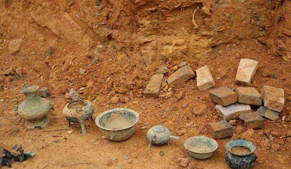 器物坑呈长方形,内有木质的器物箱,随葬器物均放于箱内,器类有铜鼎、豆、壶、盘、匜等礼器;盆、铲、盒、餐具、镜等生活用具;刻刀、削、锯等工具;还有骨梳、簪等器类。其中出土最精美的是一组铜组合餐具,它外形小巧,却内含乾坤,共能够容纳59件餐具,其中包括10个耳杯、10个小碟、10个盒子、4个碗、25个盘,外加罍形的餐具外壳,共达62件,足以供应一场十人盛宴。