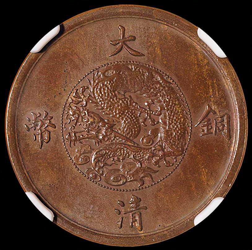 正面上方字样“宣统三年”下方“百枚换银币一圆”正中间“十文”;背面大清铜币四字包围蟠龙。老旧痕迹明显,自然的包浆,品相保存完好。在晚清铜币中,因设计新颖,图案精致独树一帜。宣统三年即是1911年,这年爆发了辛亥革命,大清王朝退出历史舞台。该铜币铸造时间短,储量稀少,是铜元珍稀品种中惹人喜爱的品种。