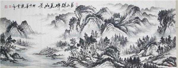 山水画的精神灵魂在笔里,笔墨质量也是创作意境的主要元素,也是他的情感的载体,再好的画法也要通过笔墨表现出来。陶祥云老师山水画注重笔墨韵味,往往以自然造化与画中山水的意境,表现山水画的整体风格气象。奇峰高耸入云,云雾虚无缥缈,挺秀山松绿意浓浓,呈现一派如梦如幻、安静优雅的山水景观,整幅作品结构布局独具特色,用扎实的墨韵真实体现出了山的独特魅力,产生一种浓烈的神往之情。