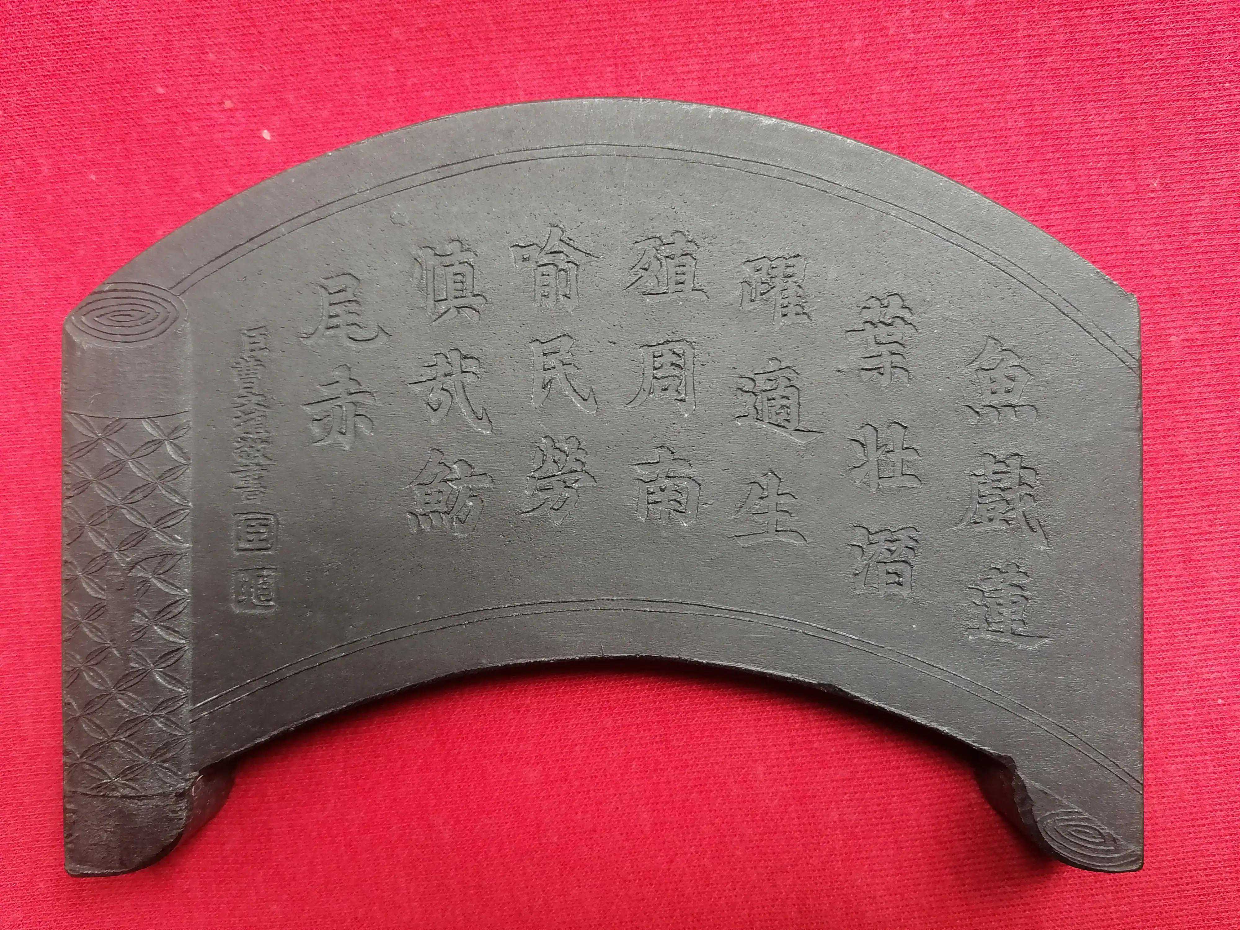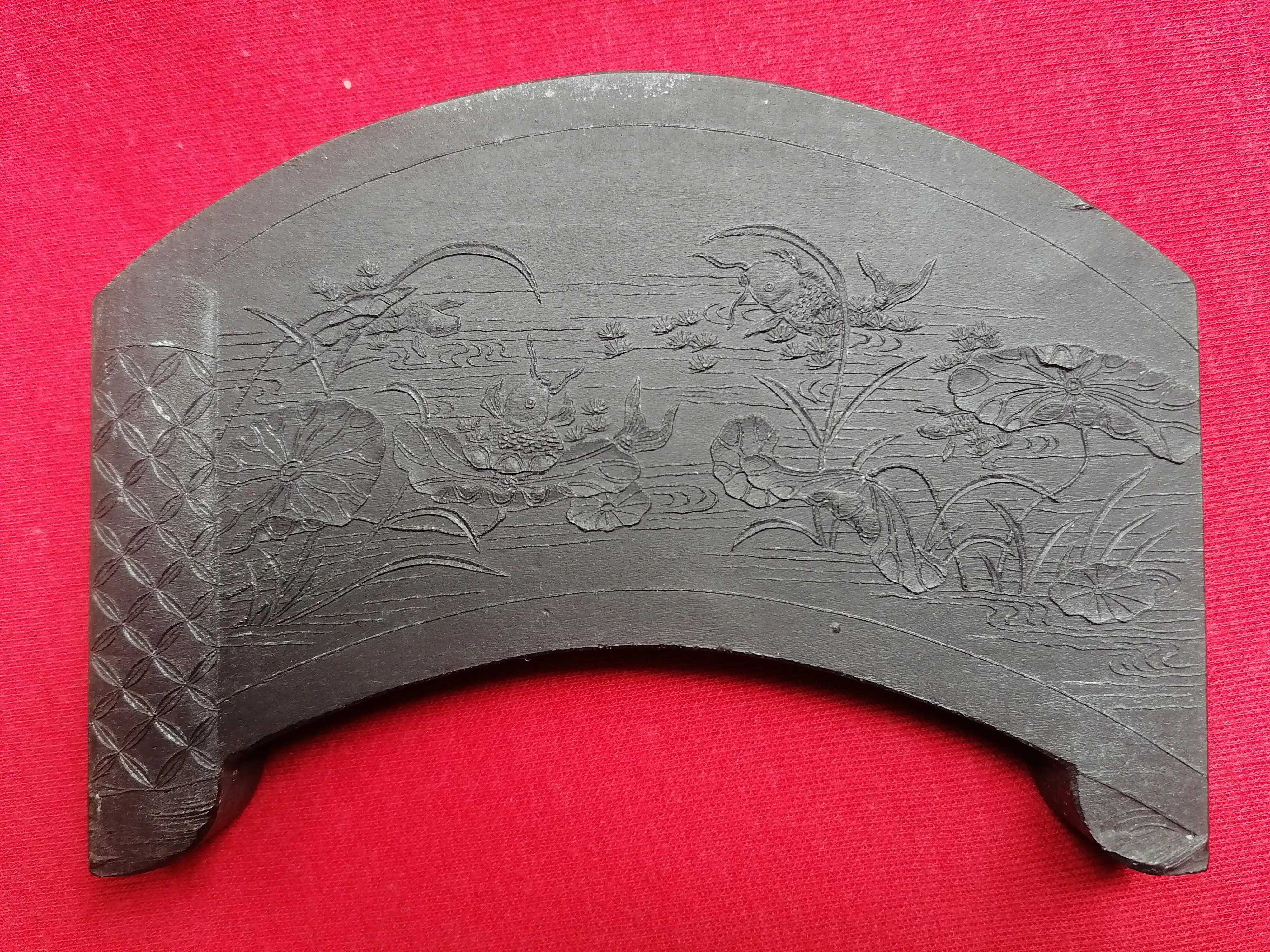 《鱼戏莲》墨,在徽墨中归属礼品墨之类,具有使用与观赏价值。适用于婚庆送礼,具有祝福夫妻恩爱,早生贵子之意。《鱼戏莲》墨成扇形,宛如一幅打开的手卷。墨可竖立,置于插屏架上,十分典雅美观。墨锭底版,阴文楷书题写着清乾隆御制诗文“鱼戏莲叶壮,潜跃适生殖。周南喻民劳,慎哉鲂尾赤。”见下图