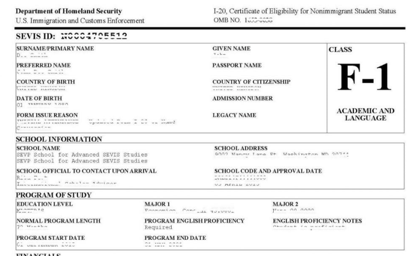 2、SEVP认证学校正式录取学生后,学校会向F1或M1学生颁发此表格。