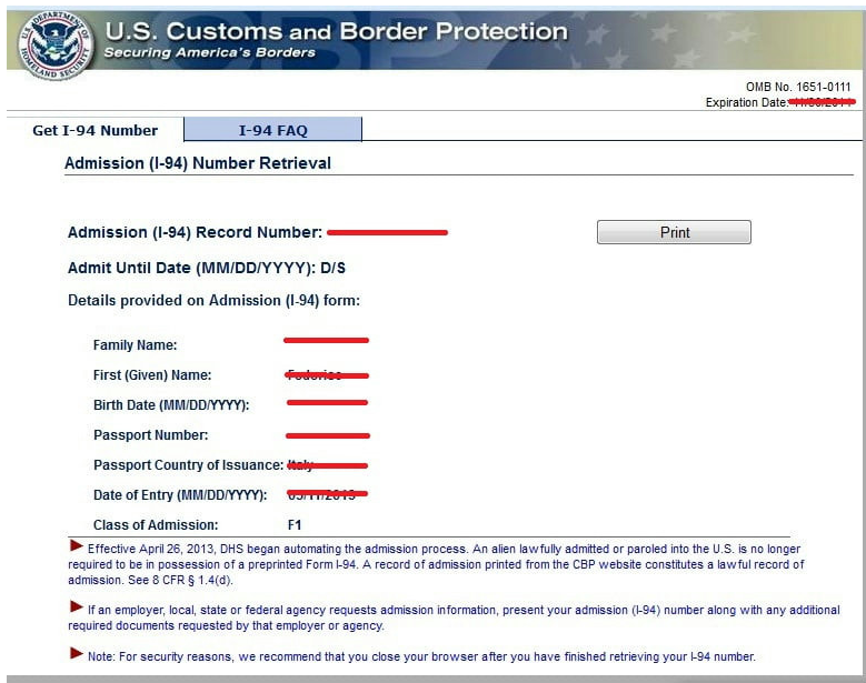3、I-94表格也记录你在美国的法律地位,包括可停留美国时间和离境时间。