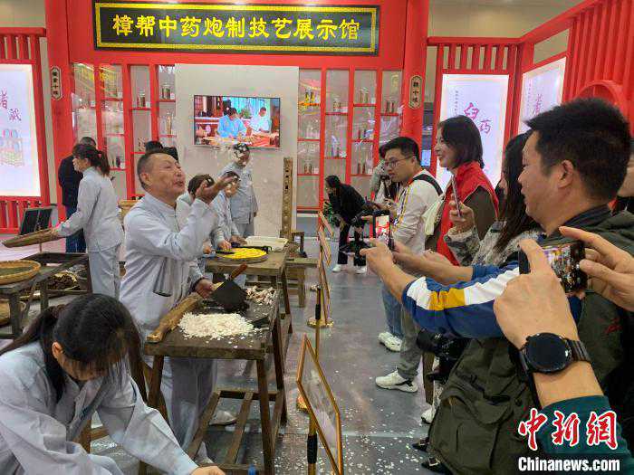 10月20日上午,在樟树岐黄小镇会展中心,樟帮传统中药炮制技艺展演精彩上演。主办方供图