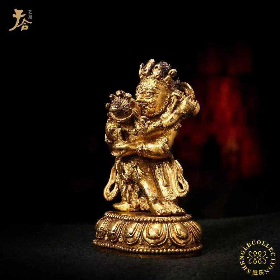 此件为“二臂玛哈嘎拉”,玛哈嘎拉是梵语,意思是“大黑”,即“怙主”之意。玛哈嘎拉有两臂、四臂、六臂,黑,白等形象,但像此种双身像非常少见,也正是此像的特别之处。整尊造像以黄铜铸造并鎏金,装饰华丽但自然适度,毫不累赘,保存完好,与明代宫廷造像铜质一至,同时又具有宫廷造像的鲜明特点,做工精细,装饰精美,可谓一丝不苟,另人叹为观止,充分显示了皇家威仪,将宫廷工艺的严谨和雍容华贵表现的淋漓尽致,具此推断为明宫廷造像。明宫廷造像一直以来在艺术品市场上表现十分突出,深受佛教艺术品爱好者及收藏家的青睐和追捧。