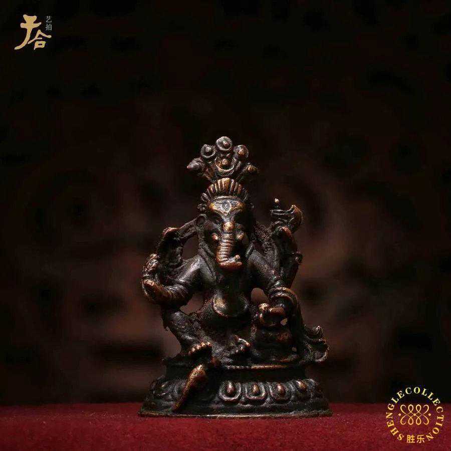 象鼻财神,梵语称“昆那夜迦”,意译“欢喜天、“圣天”、又称“象鼻天”,因其形象为象头人身而得名。他原是古印度婆罗门教崇奉的神灵,主司财富,并负责惩罚那些撒谎的人,在今天的印度及东南亚国家仍有广泛的信仰。进入佛教后,亦被奉为司财护法神。藏传佛教对其崇奉尤其突出,他与咕噜咕咧佛母、大自在组成一组三红父法,为萨迦派重要修发的“十三金法”之一。象鼻财神身姿舒展,一面四臂,头戴宝冠,并且有日月相衬,级别很高,并在同类造像中罕见。此种造型的财神像较为少见,加上做工精巧,品相良好,艺术韵味浓厚。印度的象鼻两个牙有一支是断的。唯独西藏萨迦的是完整的。