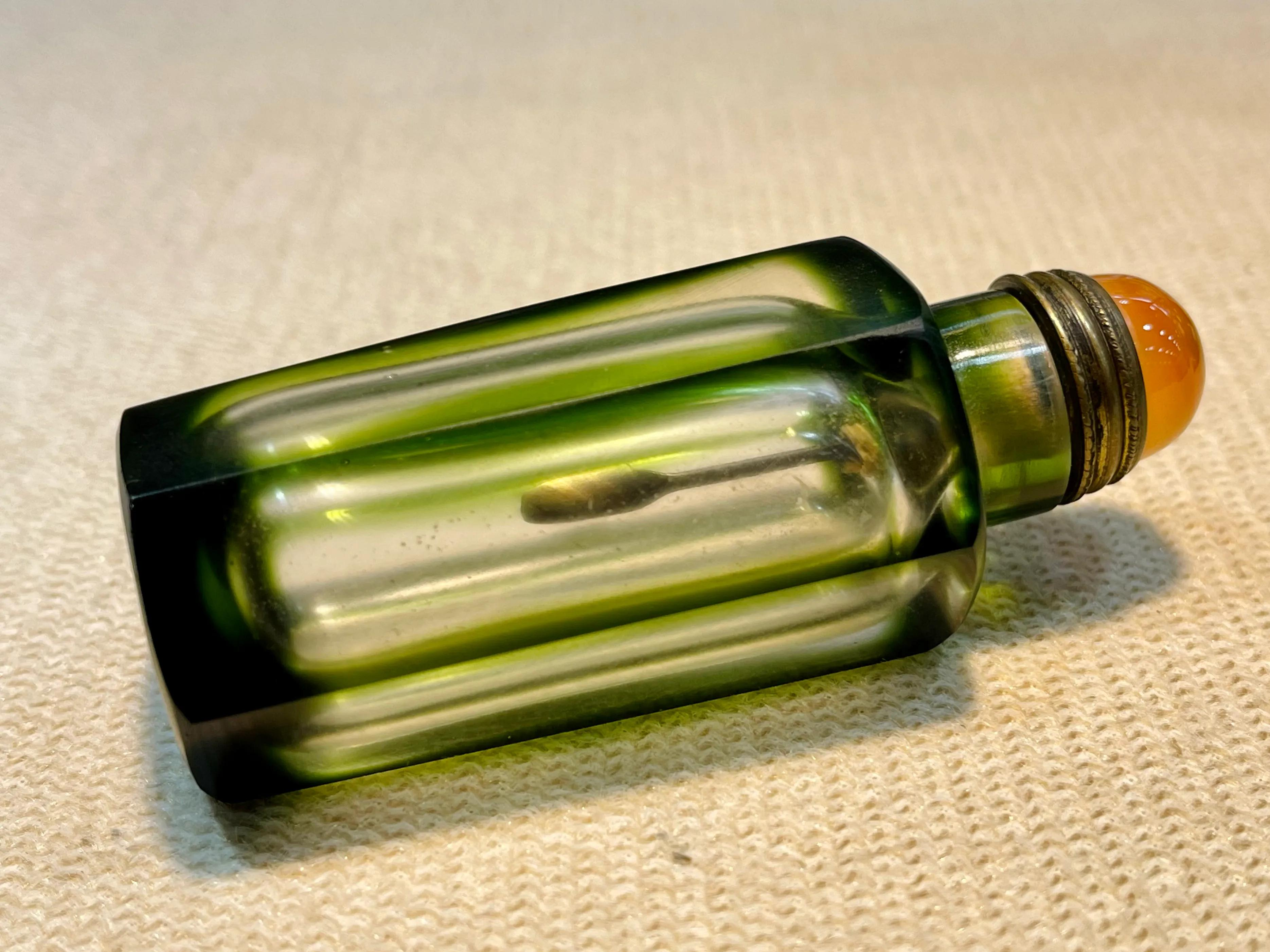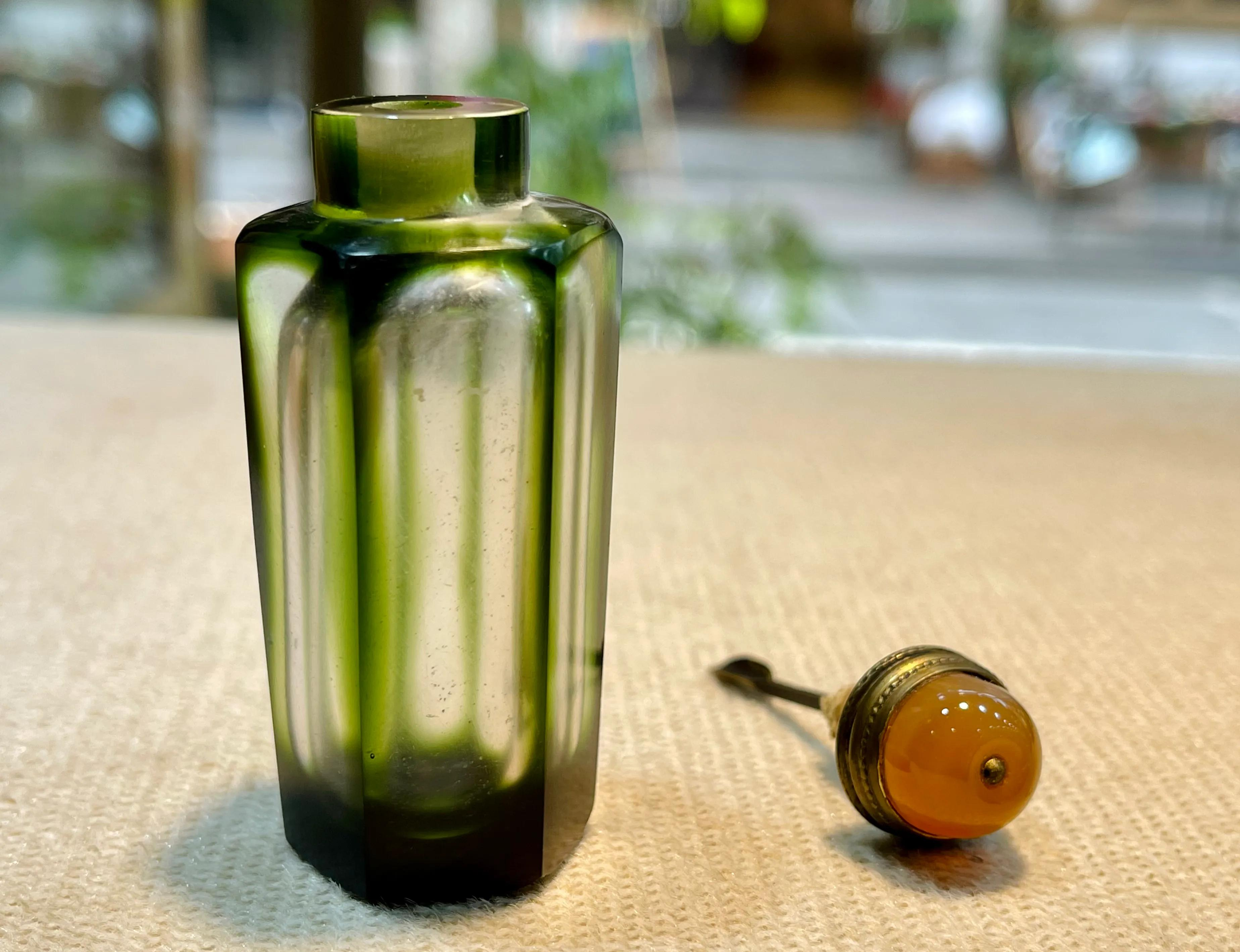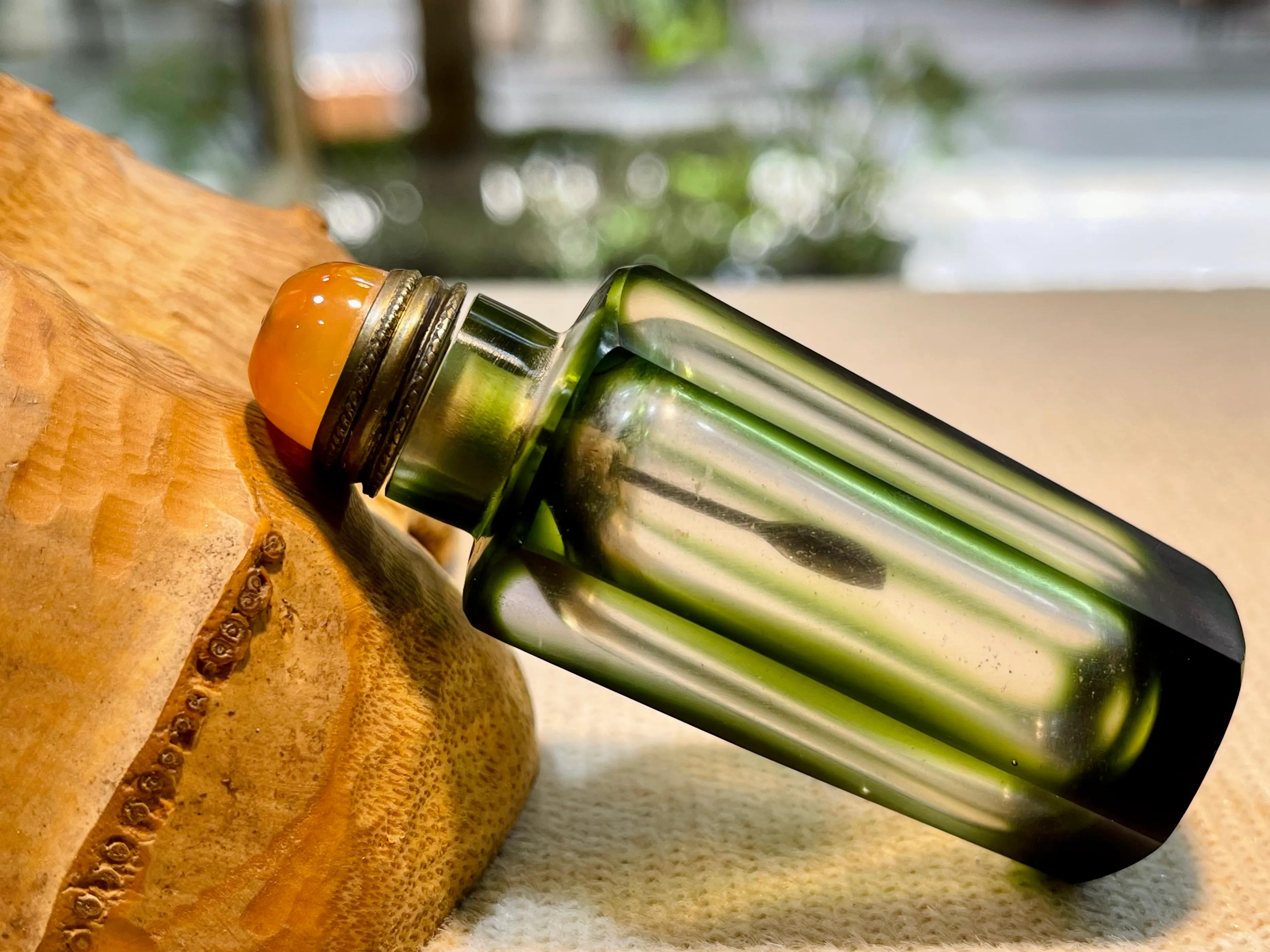 这是一只品相完好的老琉璃鼻烟壶,壶身是独特的正六边形,有一定厚度感棱角边缘打磨处理,抓握十分舒适。