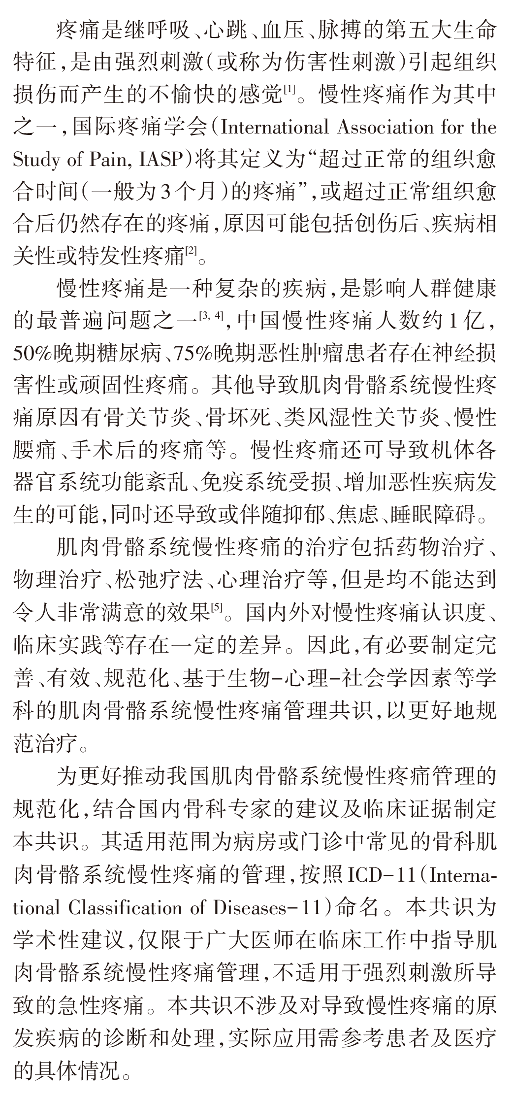肌肉骨骼系统慢性疼痛是临床最常见的慢性疼痛。目前,国内外医师对慢性疼痛的认识、临床实践环境、镇痛药物种类/使用经验/了解程度、医保药品收录均有差异,故有效、规范化的慢性疼痛管理显得尤为必要。因此,亟待制定完善的、基于生物-心理-社会医学等因素的跨学科慢性疼痛管理共识,提高广大医务人员对慢性疼痛的认识与重视、规范指导慢性疼痛的管理,提高医疗质量、降低医疗成本,消除患者感觉、情感、认知和社会维度的痛苦体验,在治疗患者原发疾病的同时,改善患者的心理需求和社会功能需求。通过查阅文献,本共识专家组遵循循证医学原则,经过反复讨论和通信修改,对肌肉骨骼系统慢性疼痛管理达成共识,供广大骨科医师在临床工作中参考。