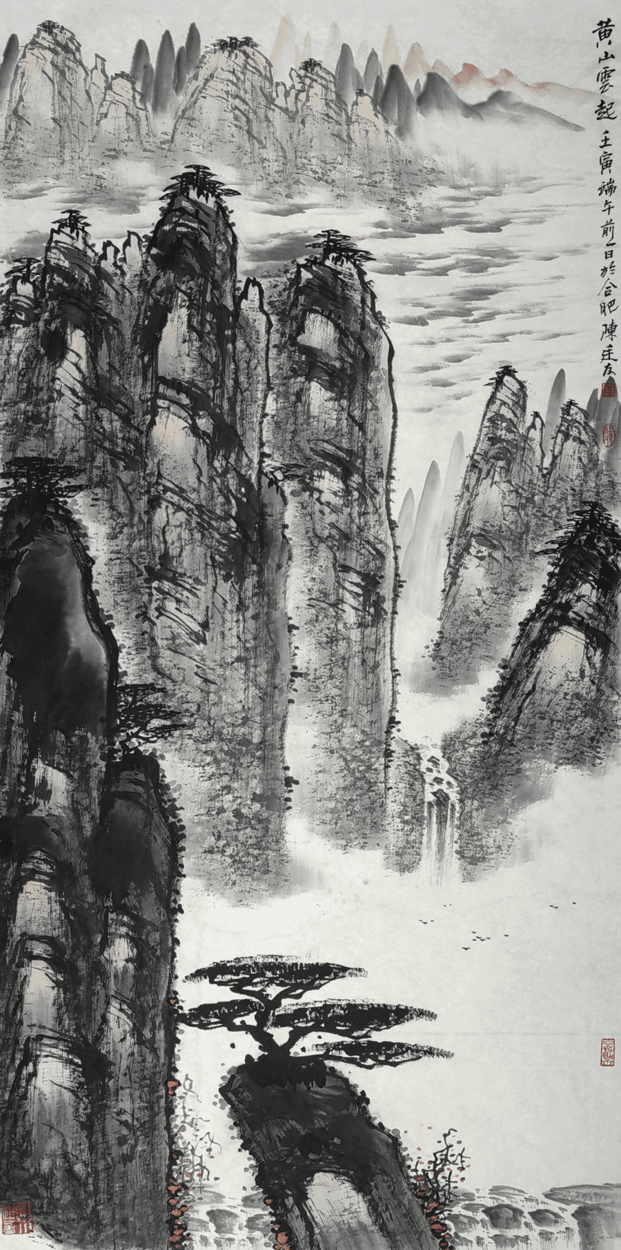 黄山的情态随四季四时而变幻,阴晴朝夕瞬息万变,廷友发现最美多在风雨后,风起云涌,山色有无,水色淋漓,大自然充满生命的律动,生机蓬勃,这正应着时代的脉搏。雨后的大自然荡涤了一切污浊、纯静而清新,天地一色,展示博大精深的雄伟气势,无杂无染又远离了烦躁不安的尘世喧嚣,这正迎合着现代人的审美理想,廷友抓住了这一自然现象,感悟到时代和人生哲理,选择了没有火气、霸气和富贵气的水墨语言恰到好处,建树水墨黄山的形态美和气质美。