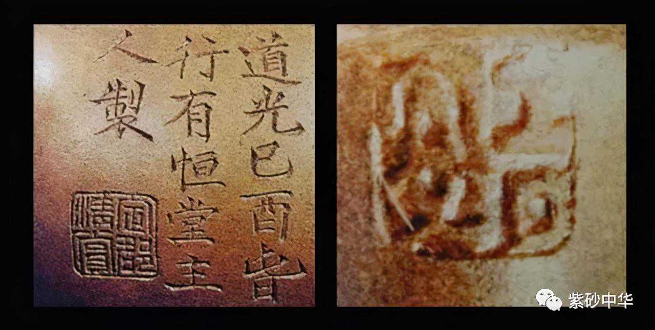 从定王府紫砂传器来看,其紫砂壶主要是吉安所制,这些传器底部署“行有恒堂”款,壶把下方落“吉安”款。也有刻“行有恒堂主人制”或“行有恒堂主人珤用”等铭,有的加“定邸清赏”方章。