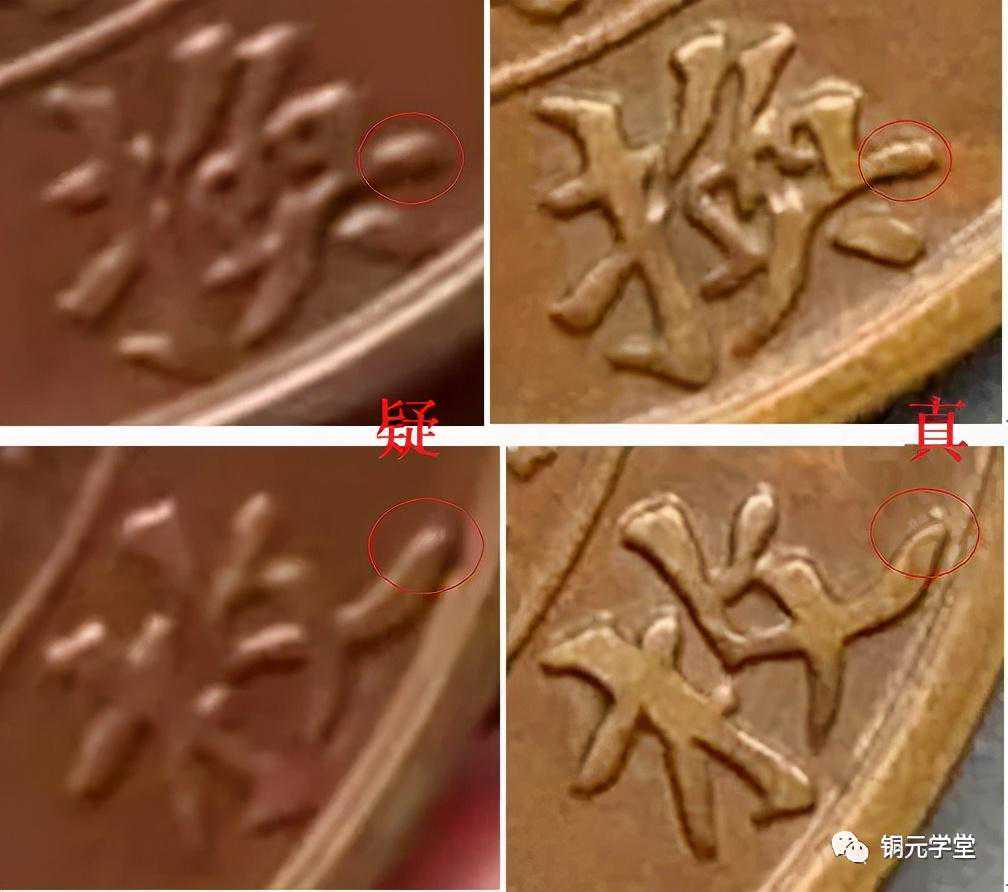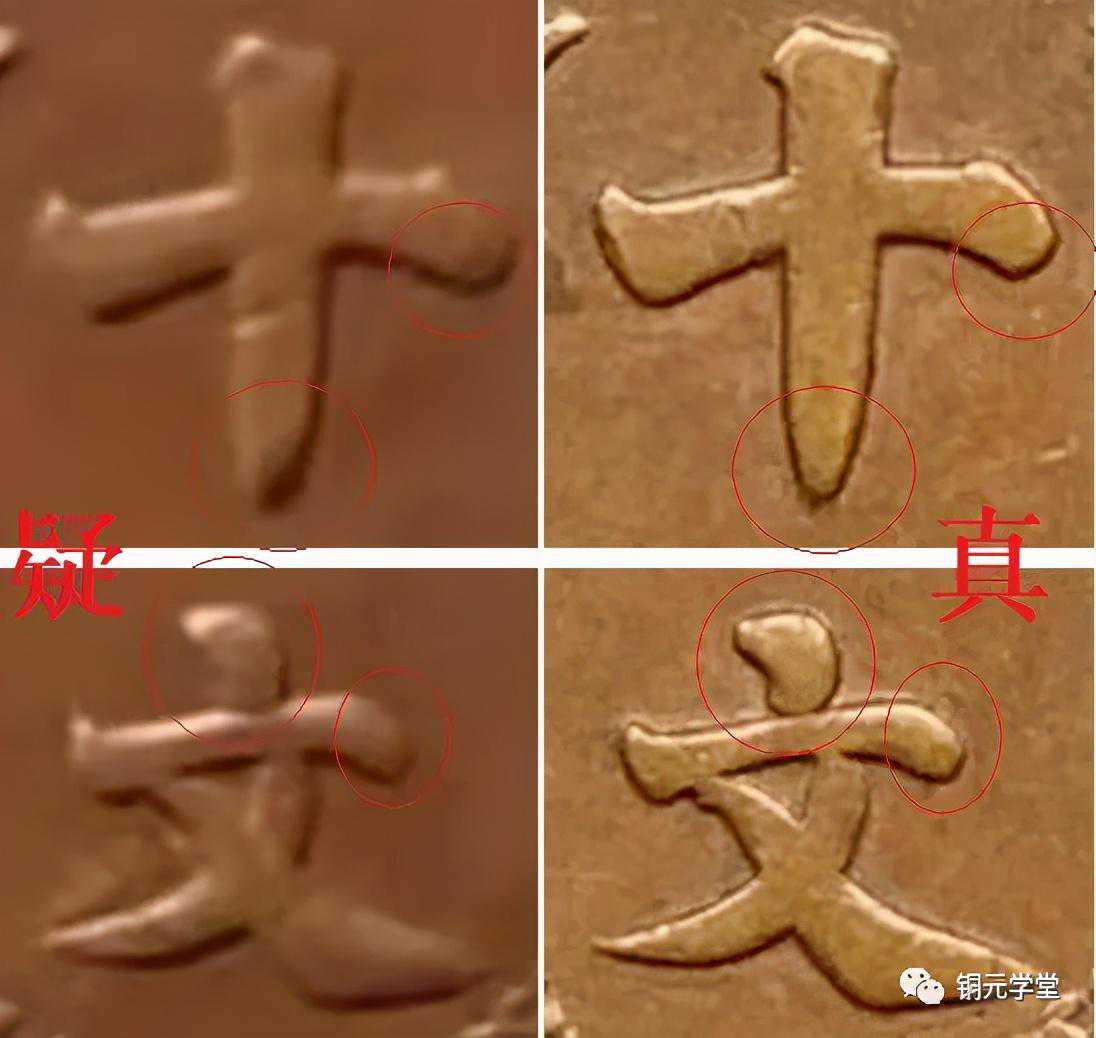我们再看文字:这一版文字的收笔(回锋)多少都有问题,比真品脱得长,于是就给人一种软的感觉。“十”字一竖的竖锋太偏了点。“文”字一点,真品的点据写书法的告诉我说,别小看这一点,至少是用3笔方能写成,存疑币的点,写的很失败。“换”字横的收笔,以及“枚”字收笔都有问题,“枚”字捺收笔有回锋。