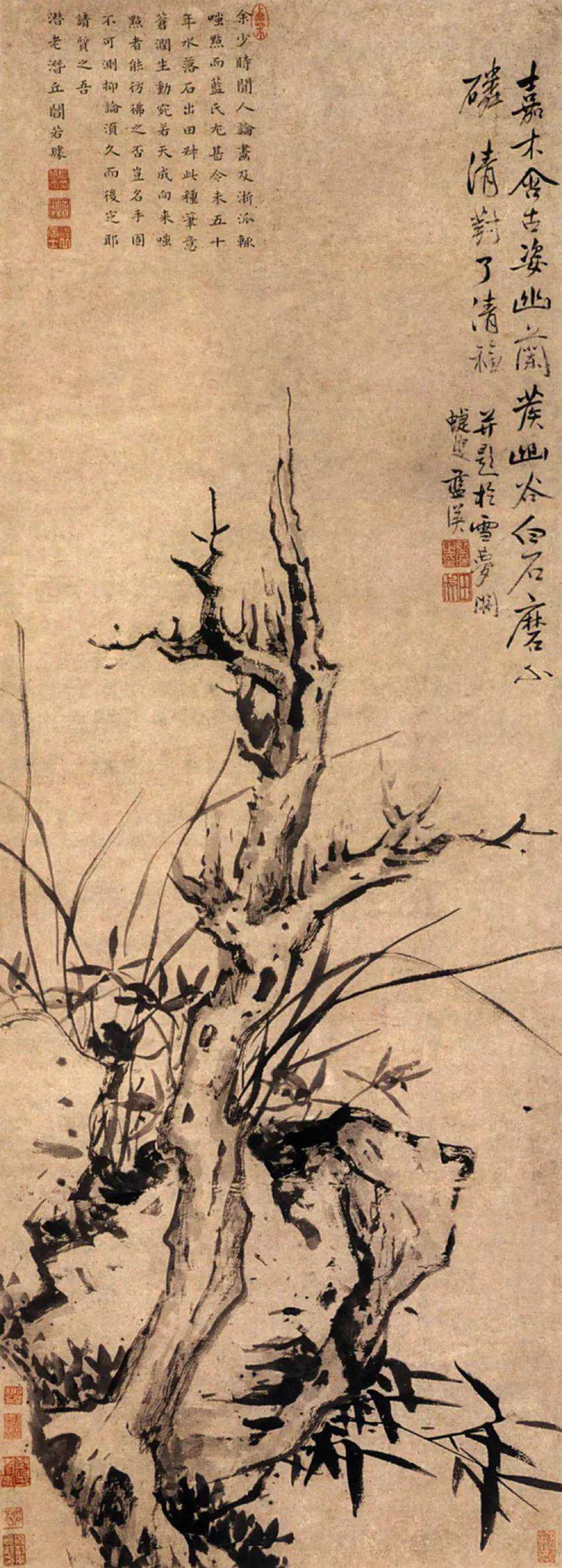 子瞻(苏东坡)做枯木,枝干虬屈无端倪,石亦怪怪奇奇,如其胸中蟠郁也。