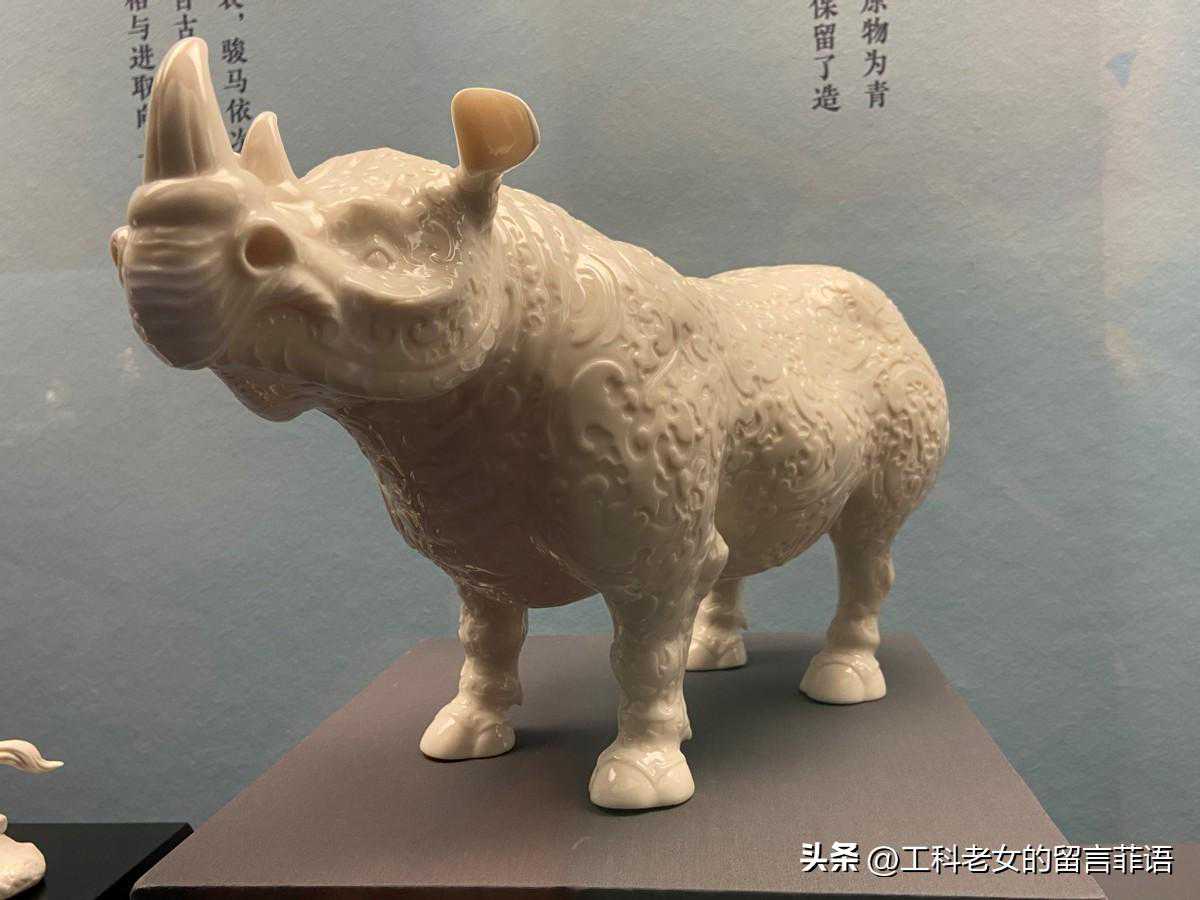 犀牛:这件作品取材于西汉一错金银云纹犀尊,犀尊为青铜材质,以瓷为原料对原作进行在创作,别有一番韵味。