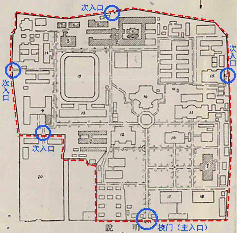1915年南京高等师范学校成立后,校园才南扩到四牌楼(街)。校园入口的数量、位置(特别是主入口的位置)也随之而有所改变。