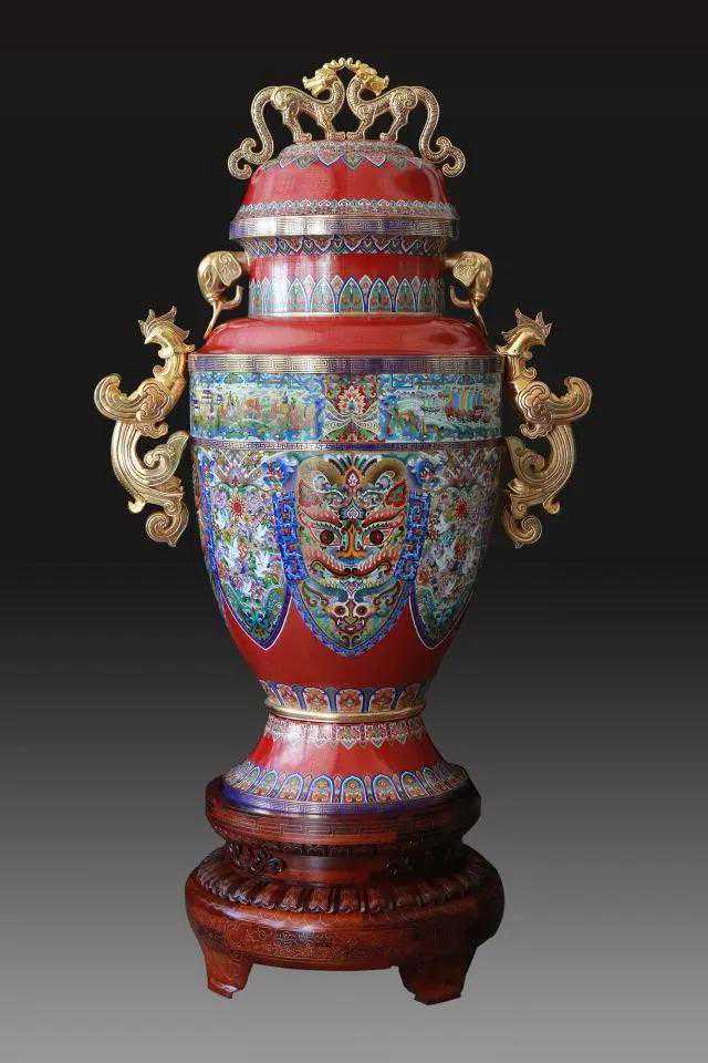 “和平尊”的制作完全遵循景泰蓝的制作工艺:在铜制的胎体上,用柔软的扁铜丝掐成各种花纹焊接其上,并将珐琅质的色釉填充在花纹内烧制而成。