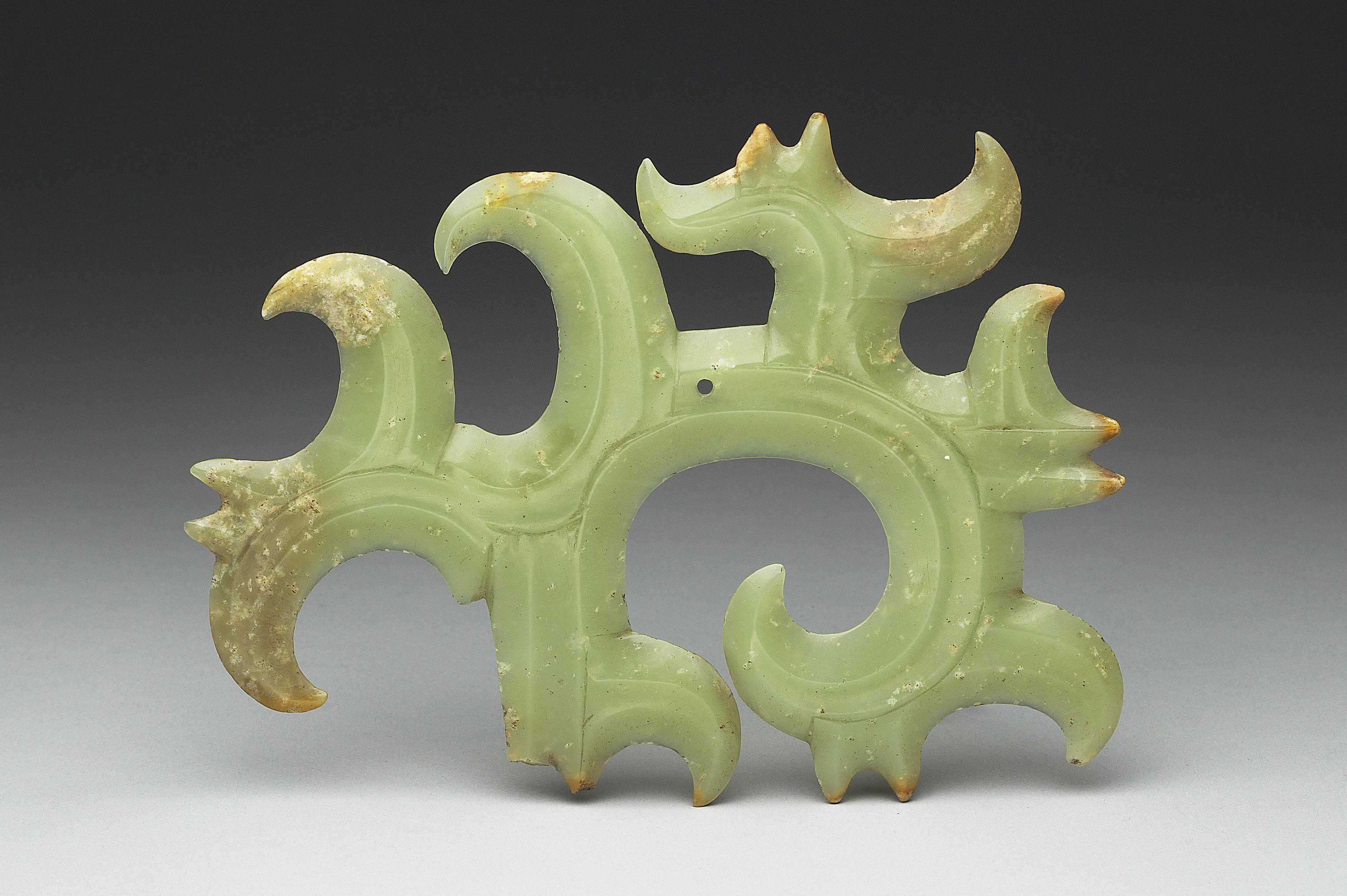 玉勾云形佩来自于红山文化晚期大约公元前3500-3000年,总体高14.2公分,宽19.1公分,最厚处为0.55公分。