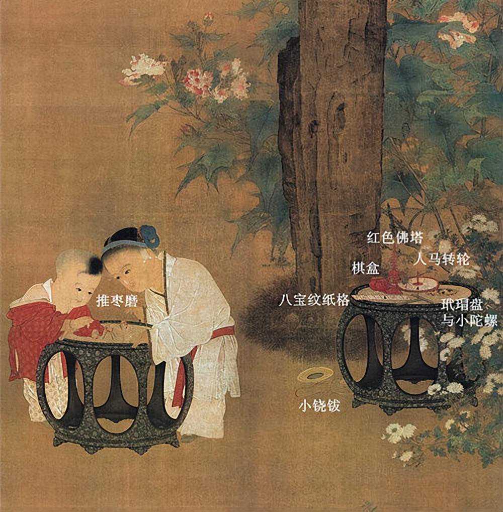 关于这幅《秋庭婴戏》的画面内容,今人陈葆真《古代画人谈略》一书有着精彩的描述:“画面偏右湖石耸立,把画面分成左右两半。右半面为芙蓉艳放,稚菊吐芳,暗示秋天。下方圆漆櫈上摆满精巧的玩具,地上铙钹一俯一仰,似乎已经失去主人关心。画面重点放在左下方的两个孩童身上。只是稚童二人,一衣白,一着红,正头挨头,弯身倚在描画的圆形漆櫈上推枣磨为戏。红衣男孩似乎占了上风,退去背上衣领的束缚,紧张又得意地正要下手。白衣女孩张开小小的嘴,露出一排细细的乳齿,伸手若有所辩。他们那样全神凝注,眼神交并,集中在桌面上那个小小的世界中,忘记了一切!”