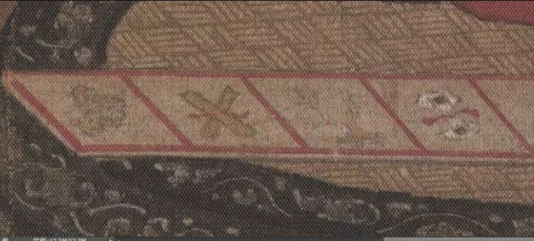 男孩则身穿红色金纹对襟罩衫,下身为白色印花裤,头发是孩童时期常见的样式,有着吉祥、阿福的寓意。他们围立在华丽的花凳旁,聚精会神的拨弄着“枣磨”这种玩具,是宋代时期流行的游戏,孩子们将两颗枣子分别插在一根竹棒的两端,又用三根竹签支起另一个被削掉一半,漏出枣核的枣子。他们将竹棒横立在枣核之上,比谁能将其转动更长时间。