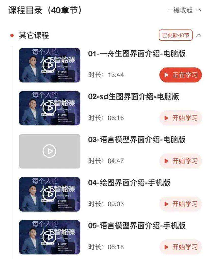 就拿李一舟199元的AI课程来说,锌财经了解到其共有三十九节课,具体包括一舟生图界面介绍、SD(StableDiffusion)生图界面介绍、语言模型界面介绍、绘图界面介绍、语言模型界面介绍、什么是算力和token、人工智能的10种用法、什么是人工智能与等。
