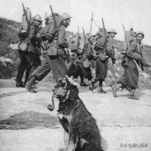 1915年,法国士兵好奇地看着马路上一只戴着墨镜并抽着烟斗的狗