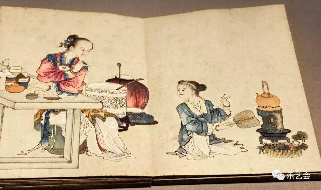 本图描绘仕女品茶,茶具种类丰富、功能齐备,表现了仕女对饮茶用水、用器和方法的讲究,是茶文化融入女性闺房生活的写照。