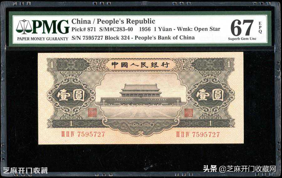 3:1956年中国人民银行第二版人民币1元,编号IIIIIIV7595727,PMG67EPQ,美品,成交价格:HKD21600