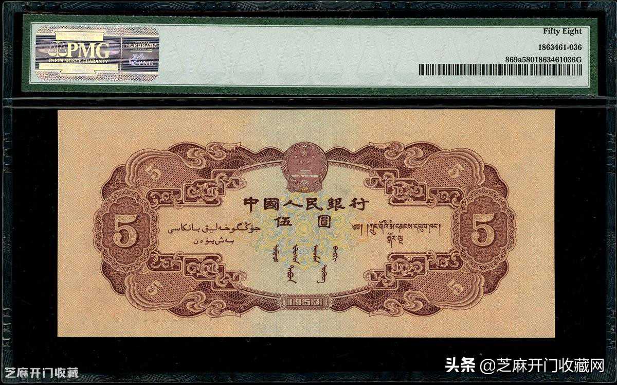 5:1953-56年中国人民银行第二版人民币5元,编号XIIX8491722,PMG58,成交价格:HKD15600