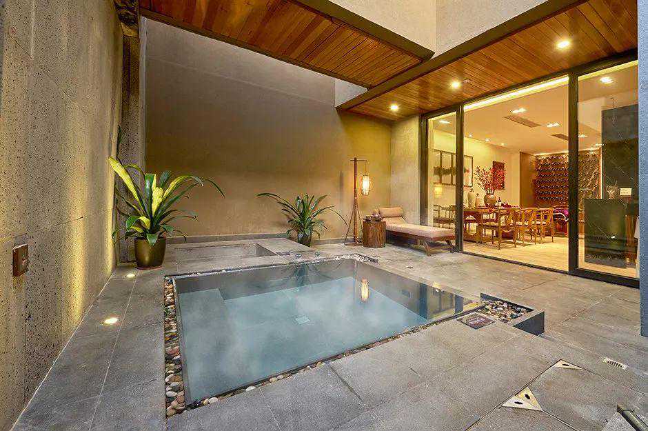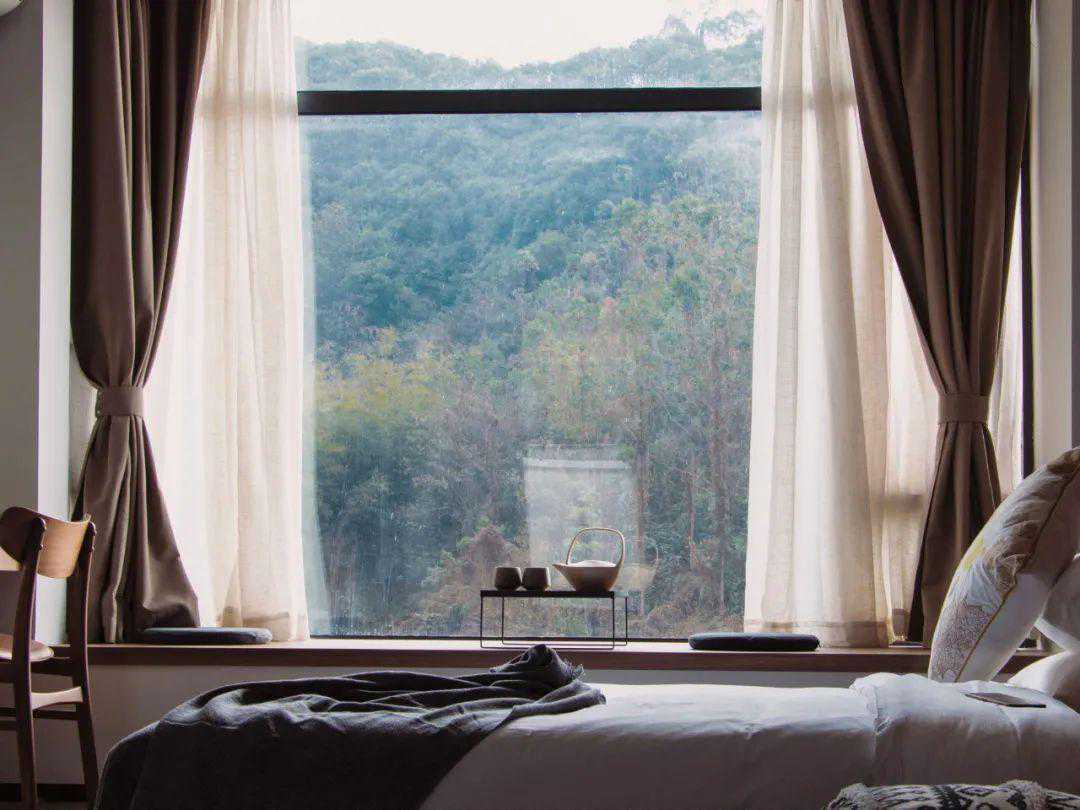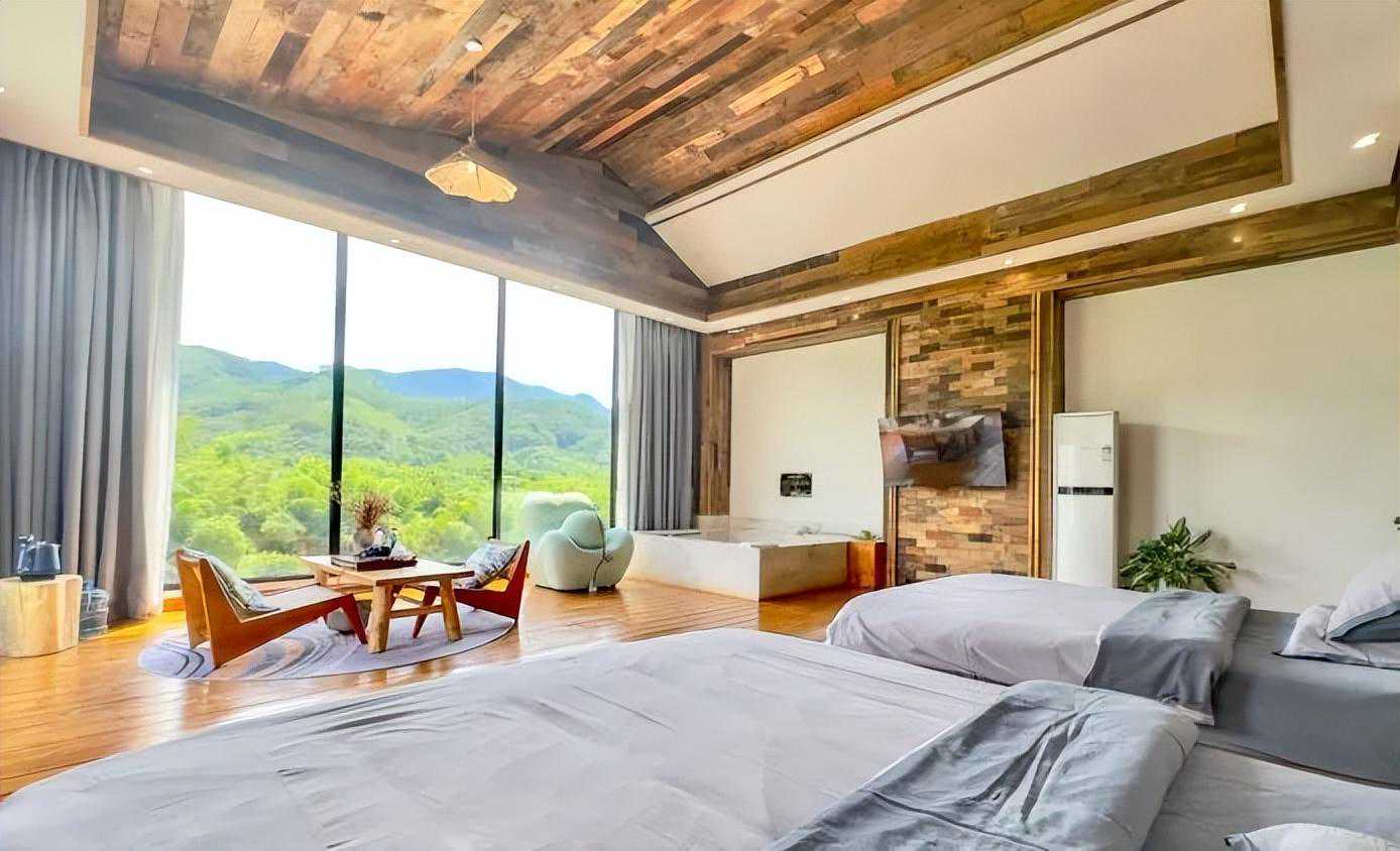 暮云山居民宿共有十三间客房,不仅全屋木制家具及地板,且每间都装配全景落地窗,更有私家温泉泳池。