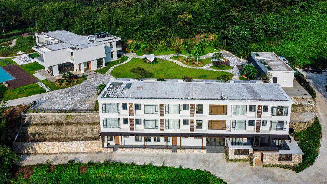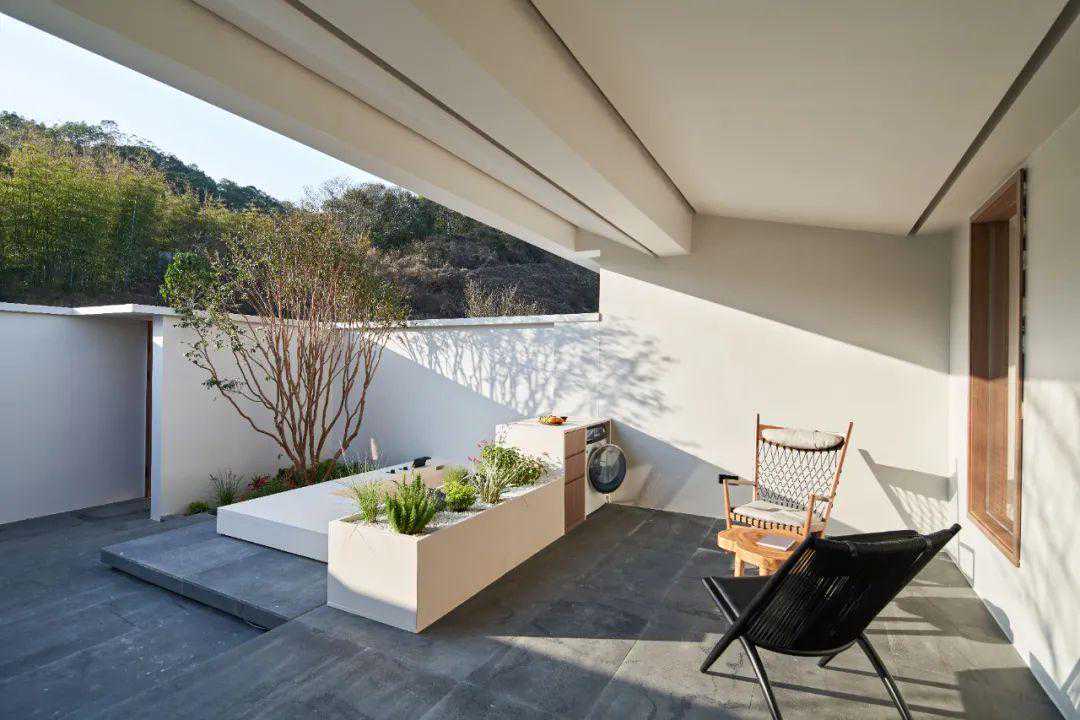 民宿是错落式的5层建筑,配套了9间宽敞豪华大房,每间客房都有独立的温泉池和超大露台,风格简约,视野开阔,足不出户就能在露台将乡村美景尽收眼底。
