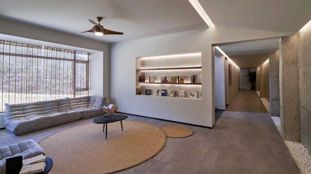 民宿园区内共有3栋建筑物12间客房,均分布在位于园区中央的下沉式建筑中,共有7间庭院房和5间山景房。下沉式的设计使得房间合理分布,满足不同客人的入住需求。