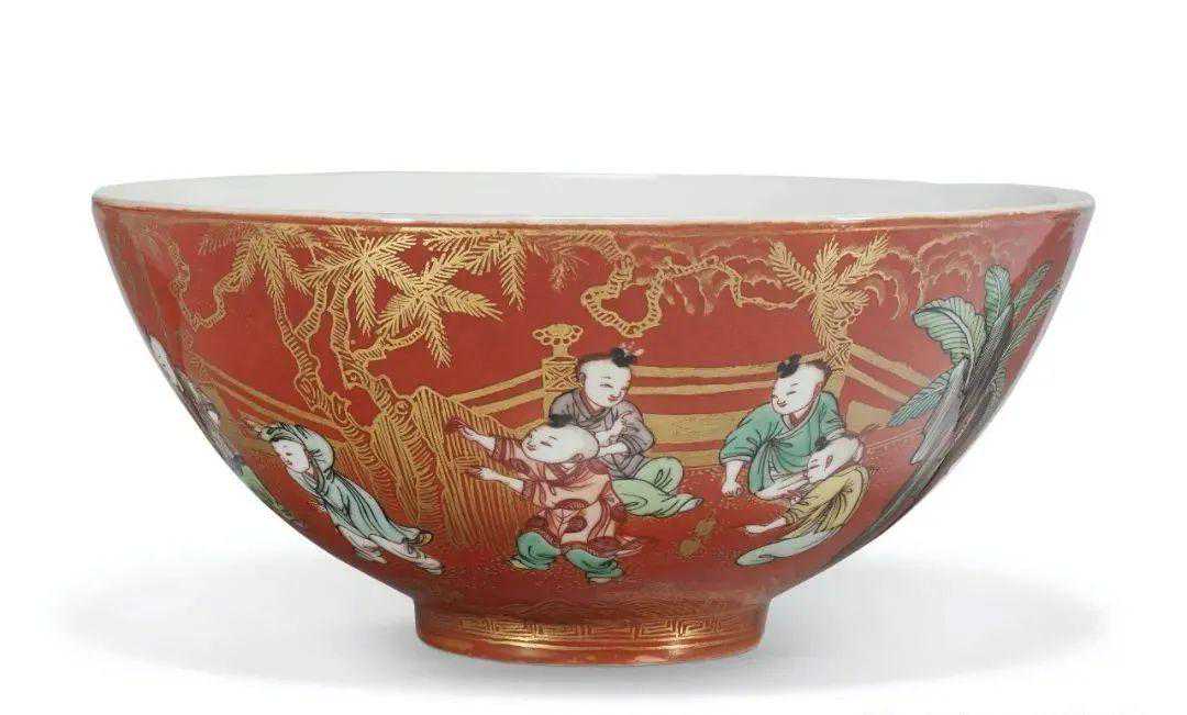 清康熙珊瑚红地五彩描金婴戏图碗(13.2万)