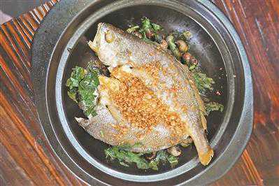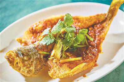 “参巴酱淋黄花鱼”是东南亚风味的黄花鱼烹调法,用新加坡的传统配方,用多达十几种香料手工炒制参巴酱,调入了少许番茄汁、虾酱和酱油,让酱料甜辣酸咸皆备,赋予黄花鱼独特的风味。砂锅黄花鱼汤,是用煎香的黄花鱼经猛火炖煮,炖出奶白色,才算好鱼汤;黄花鱼溜采用福建当地独有的炝溜做法,以纯地瓜粉包裹,保持着鱼肉的嫩滑口感,搭配鲜蔬更开胃;咸鱼炒芥蓝,这或许是从潮汕菜里节俭而来。黄花鱼制作的咸鱼丁成了芥蓝的最佳新标配,鱼油让芥蓝焕发别样鲜爽。
