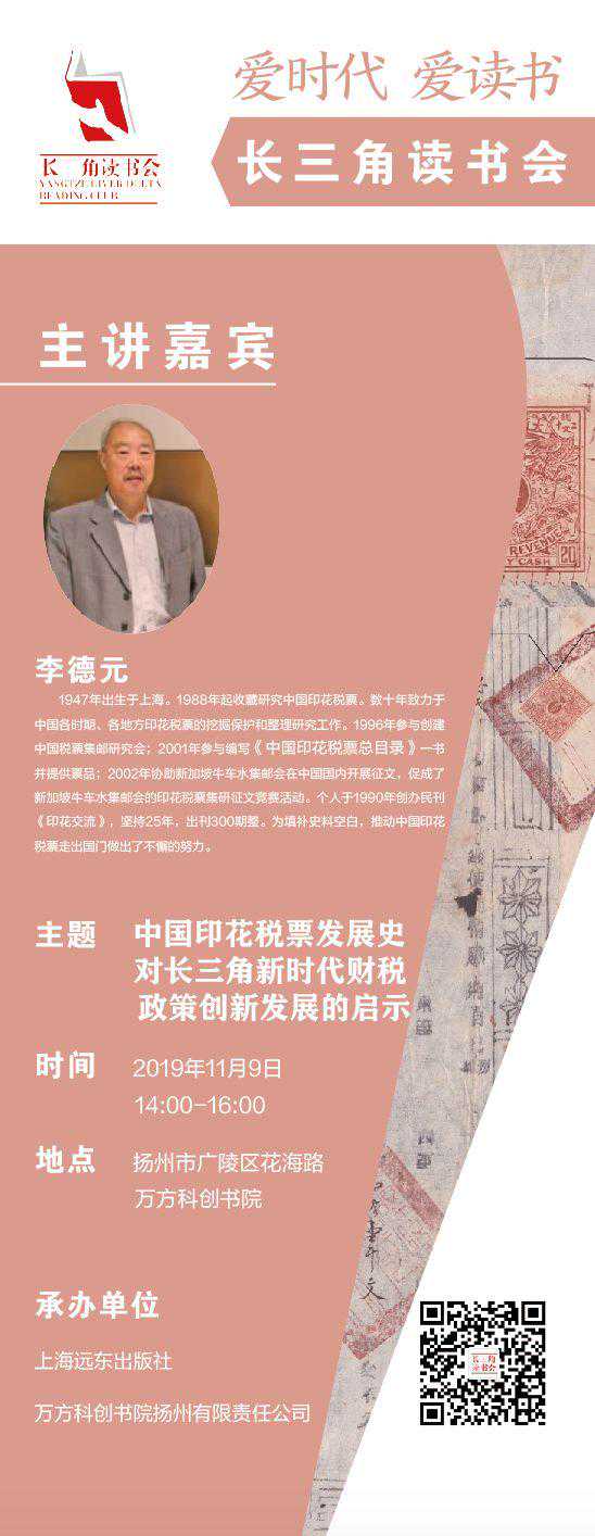 11月9日(周六)下午14:00—16:00,《中国印花税票图志——印花交流精粹选编》作者李德元先生,在扬州万方科创书院现场为您解读中国印花税票的今昔。