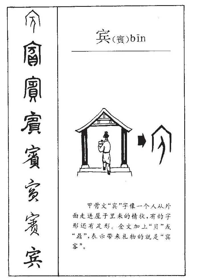 康熙字典笔画:14。本义:地位尊贵、受人尊敬的客人,贵客。《说文解字》:'賓,所敬也'。多音多义字,念bīn时,指的是归顺、服从,也指客人。念bìn时,指的是排除、摈弃的意思。用作人名意指上宾、佳宾、贵宾之义。