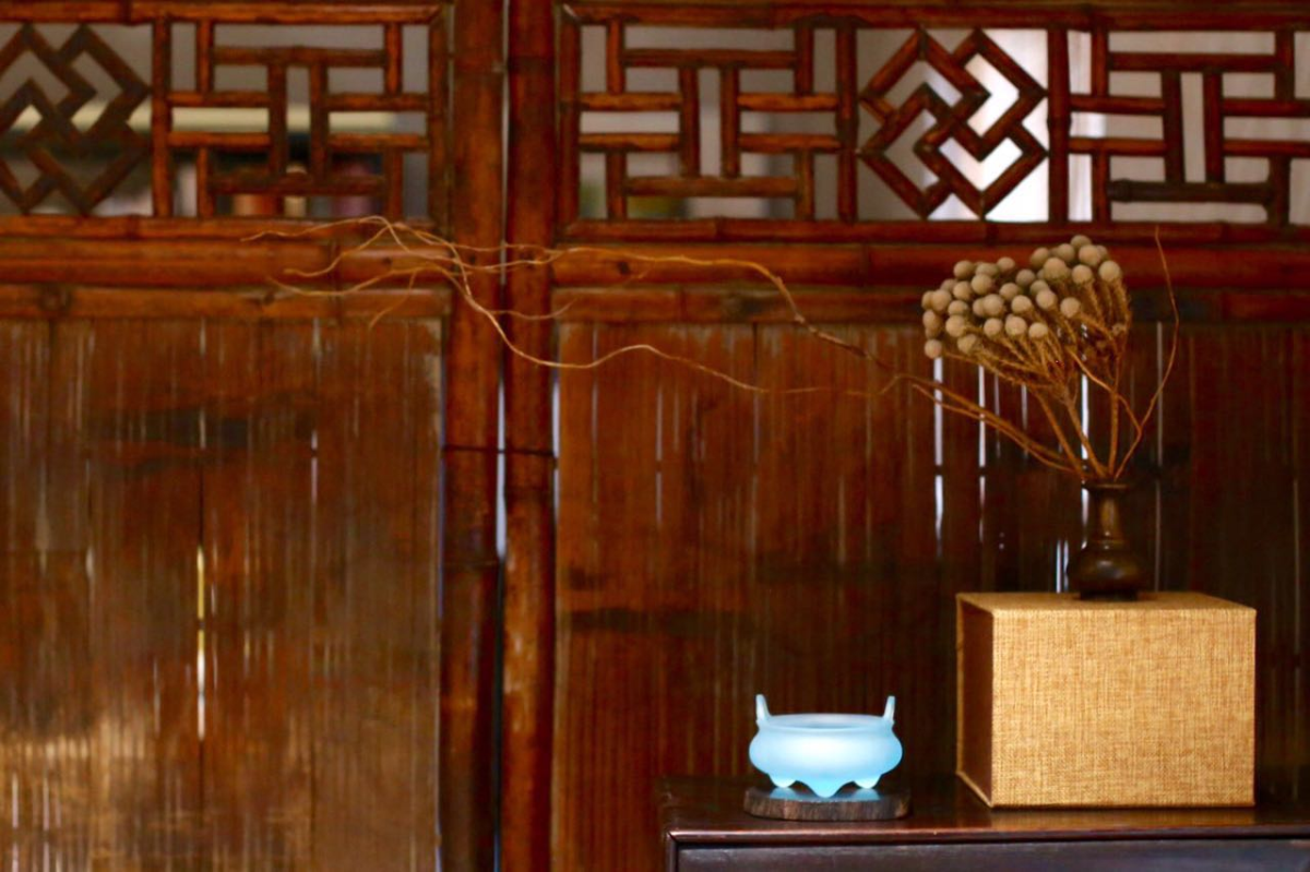 “逸舍”陈列牧之的琉璃藏品:古铜色狮耳炉、宝蓝琉璃药师寸佛、战国蜻蜓眼老琉璃珠、高古水晶珠……牧之发自内心地热爱琉璃,对于他来说,“藏品”不是被束之高阁的高冷玩物,而是生活中朝夕相处的亲切伴随。