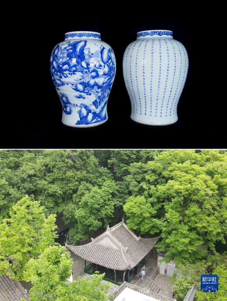 这是一张拼版照片,上图为:《清康熙青花山水诗文大将军罐》,文物上绘有醉翁亭主题的图案,现收藏于滁州市博物馆(滁州市博物馆供图);下图为:5月17日拍摄的位于安徽省滁州市琅琊山景区内的醉翁亭(无人机照片,新华社记者张端摄)。5月18日是国际博物馆日,记者将安徽各地博物馆的文物与醉翁亭、八公山、逍遥津等现实风景链接,通过古今映照的方式呈现博物馆藏品蕴含的人文地理之美。新华社发